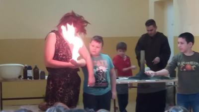 Dnia 08.02.2016 roku naszą szkołę odwiedziła GRUPA ZAELEKTRYZOWANI, która zaprezentowała nam niecodzienną lekcję przyrody pt. " Czy to magia??Nie, to czysta chemia". Zobaczyliśmy niezywkłe eksperymenty chemiczne z możliwością uczestnictwa naszych uczniów, irytujące ciekawostki o budowie organizmu. Zabawa była bardzo ciekawa a zarazem zabawna.