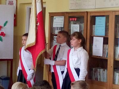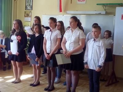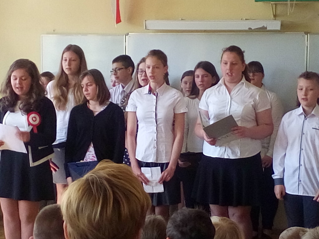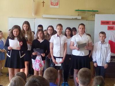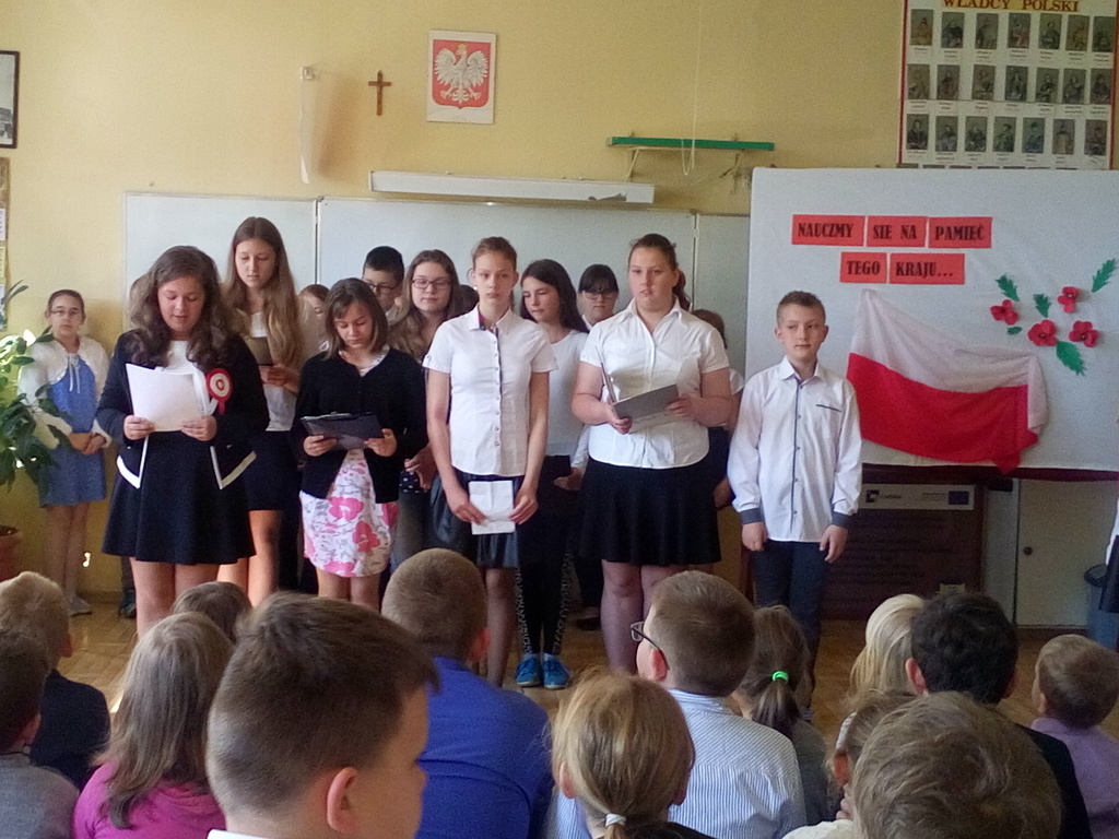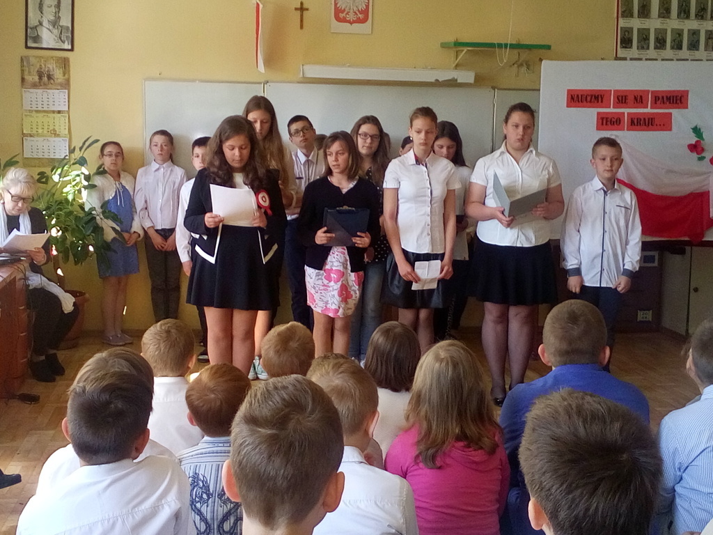 "Nauczmy się na pamięć tego naszego kraju"- to hasło było motywem przewodnim akademi z okazji Konstytucji 3 maja. Uczennice klasy VI recytowały wiersze o treści patriotycznej nawiązujące do tej uroczystości. Podniosłą atmosferę podkreśla piosenki w wykonaniu chóru. Uczniów naszej szkoły zapoznano z okolicznościami ogłoszenia Konst zadanie wychowawczeytucji 3 maja oraz treścią ustaw tego dokumentu. Uczniowie w ten sposób realizowali zadanie wychowawcze szkoły - kształtowanie patriotycznej postawy.