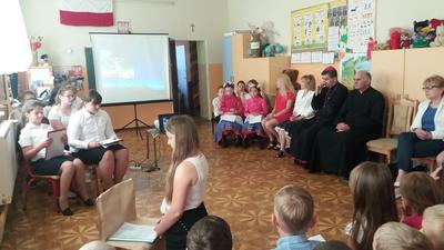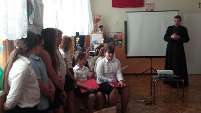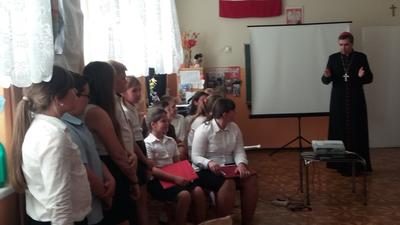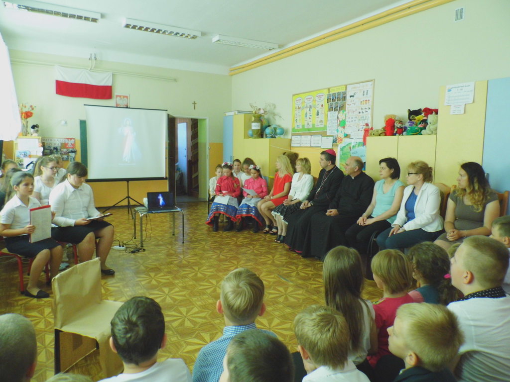 Ksiądz Biskup wysłuchał krótkiego programu artystycznego pt „ Gdyby znali grzesznicy moje miłosierdzie”, przygotowanego przez Panią Iwonę Poznańskaą, w którym uczniowie przedstawili Postać św. Faustyny i historię Święta Bożego Miłosierdzia. Zwracając się do zebranych ze Słowem Bożym ks. Biskup podkreślił, jak ważne w dzisiejszych czasach jest kierowanie się miłością i miłosierdziem. Spotkanie zakończyło się udzieleniem pasterskiego błogosławieństwa dla całej społeczności szkolnej.