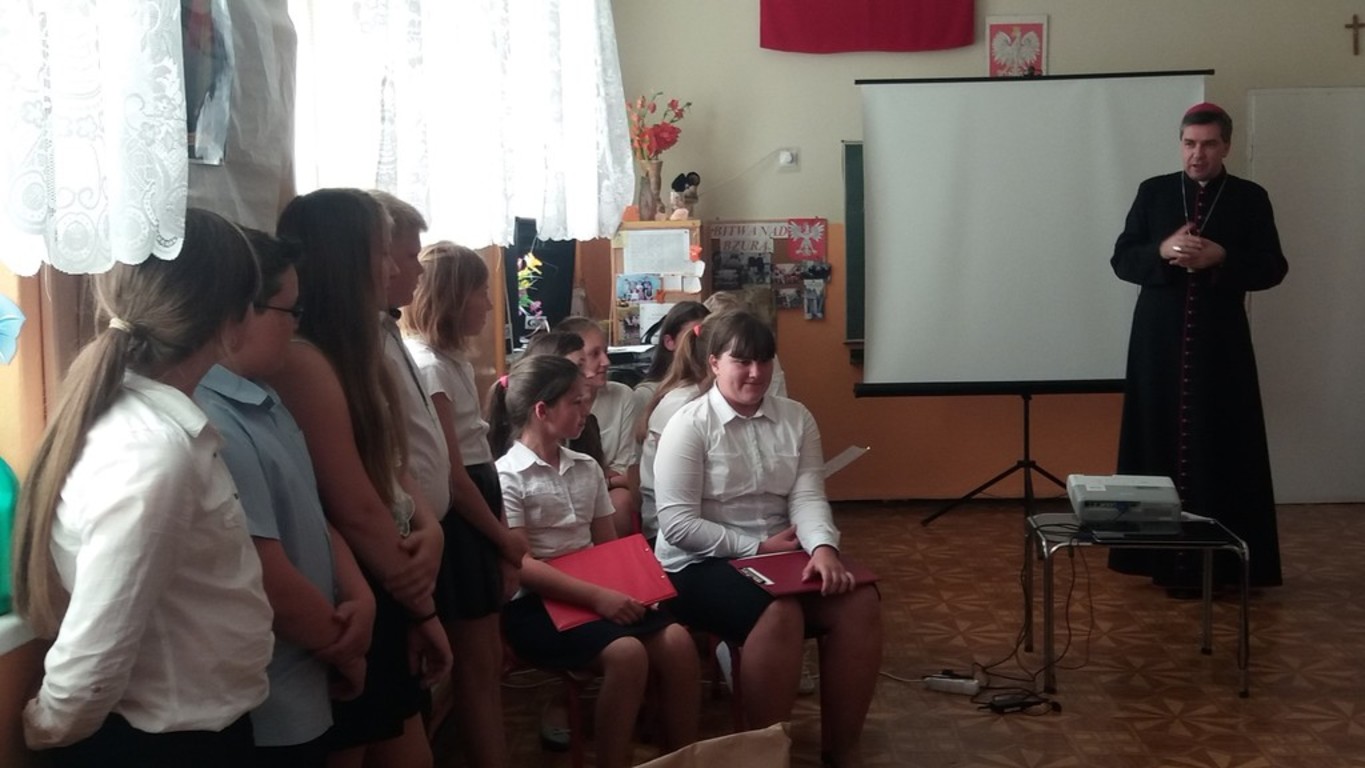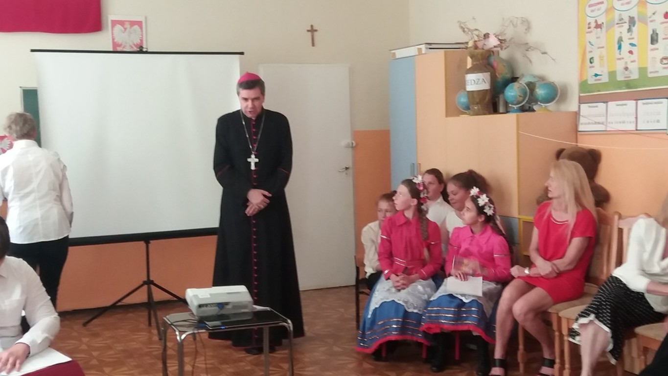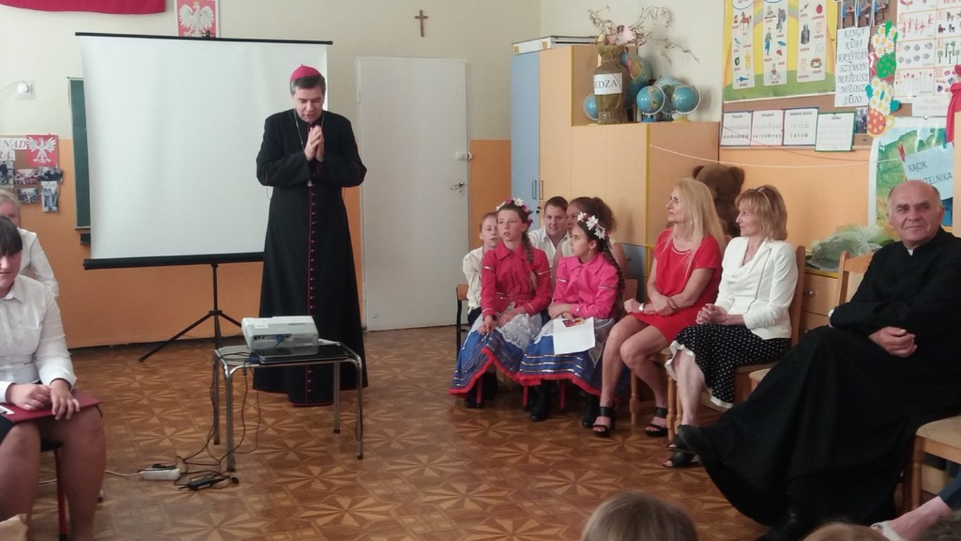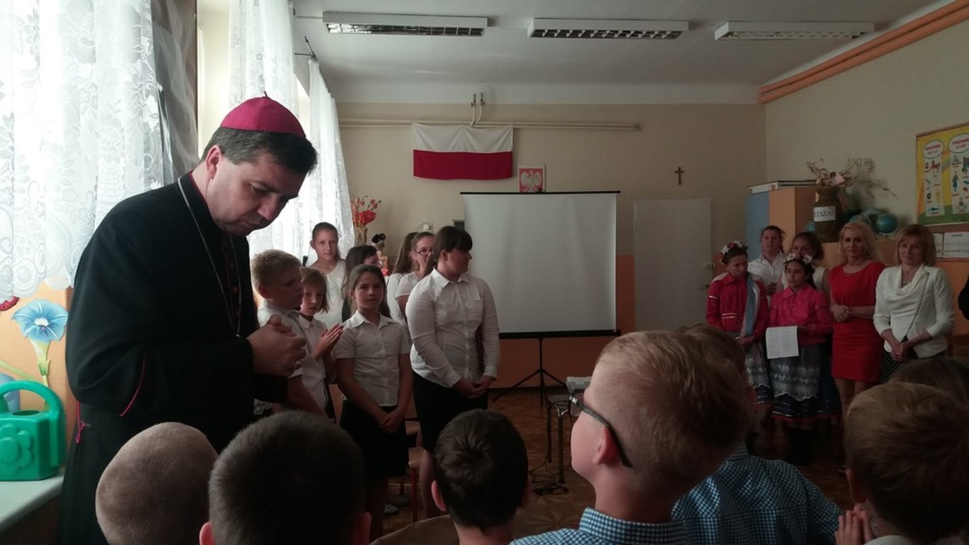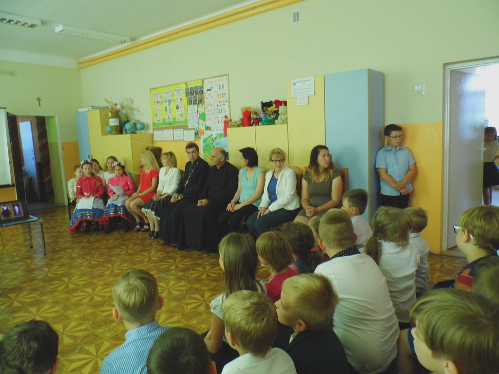 Z okazji wizyty kanonicznej Parafii p.w. Św. Floriana w Nowem dnia 30.05.2016 r. gościł w naszej szkole Ksiądz Biskup Wojciech Osial oraz Ksiądz Proboszcz Krzysztof Kuśmirek. Pani Dyrektor Beata Cieślak serdecznie powitała przybyłych gości, a uczniowie w strojach ludowych wręczyli kwiaty oraz zaśpiewali piosenkę.