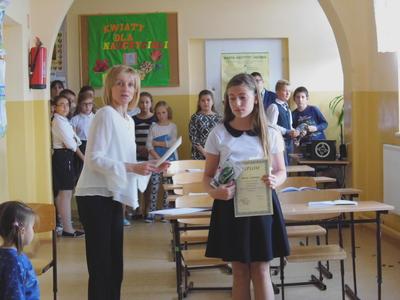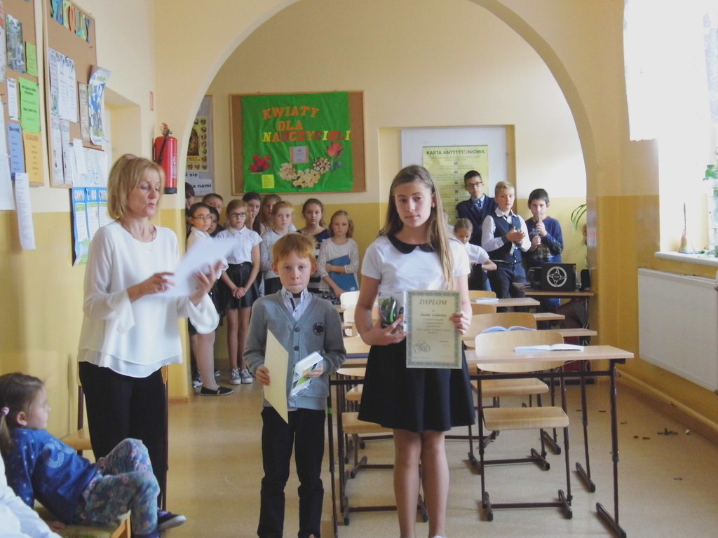Pani Paulina Wojda i pani Anna Nyckowska podsumowały konkurs fotograficzny pt. „Miejsce pamięci narodowej w naszym obiektywie” i przyznały nagrody Monice Golińskiej z kl. V oraz Klaudii Gołębiewskiej z kl. VI za zdjęcia najlepiej ukazujące miejsca pamięci narodowej w naszej okolicy. Wszyscy uczniowie biorący udział w tym konkursie dostali drobne upominki.