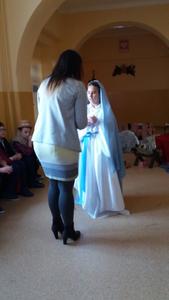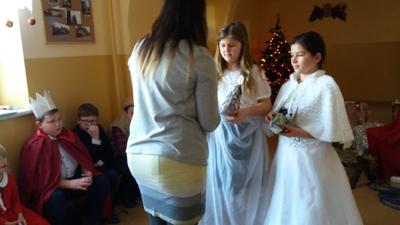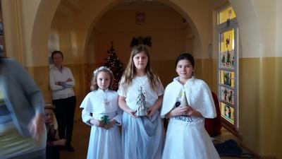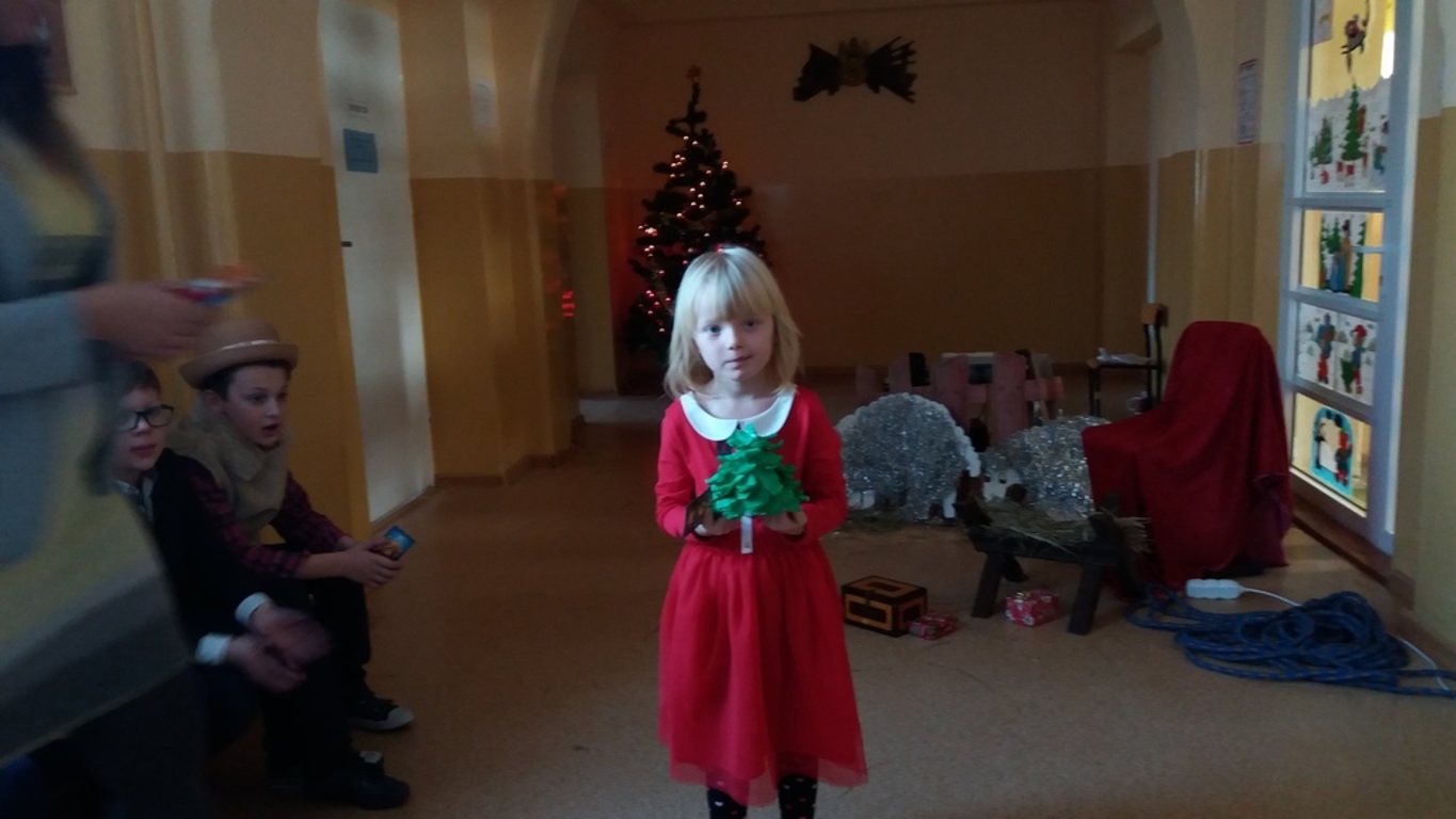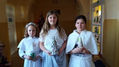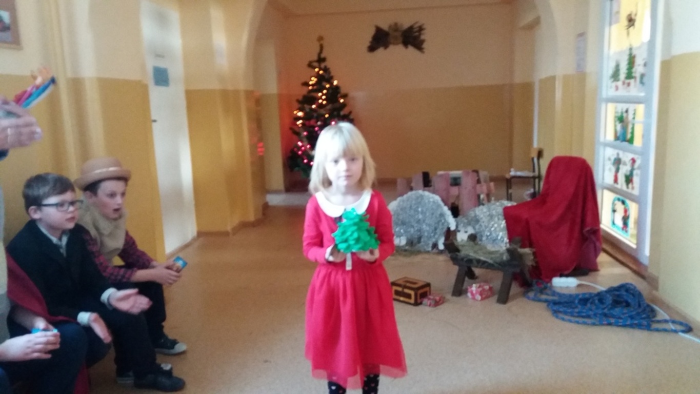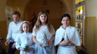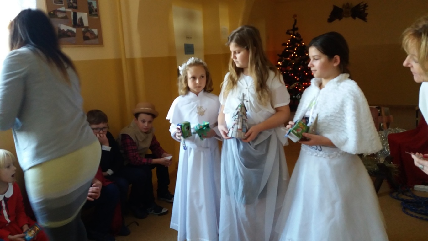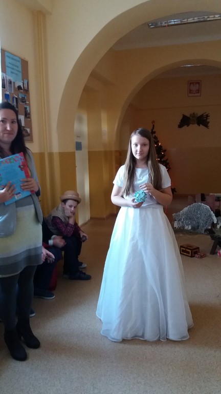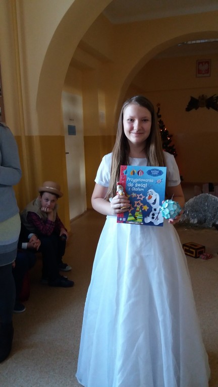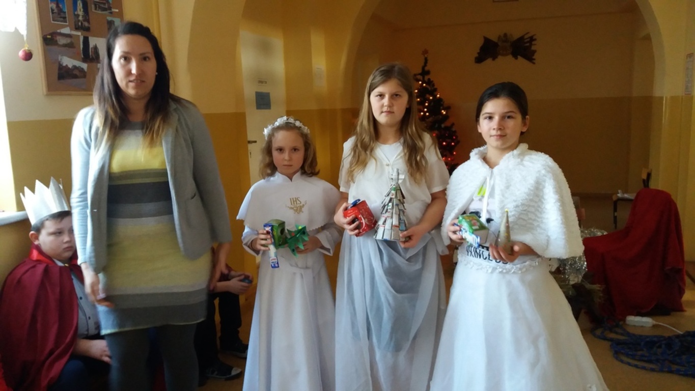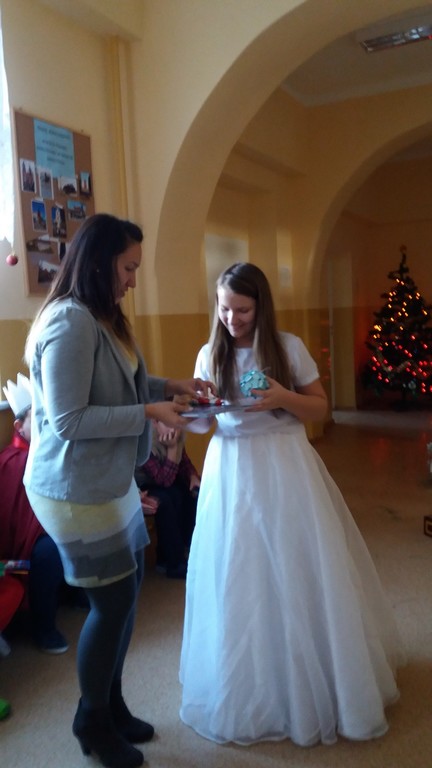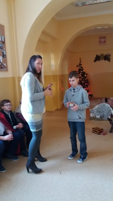 Pani Magdalena Domżał rozdała nagrody w konkursie "Przestrzenne choinki bożonarodzeniowe", w których uczniowie zdobyli następujące miejsce: