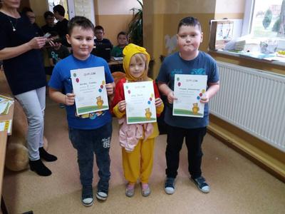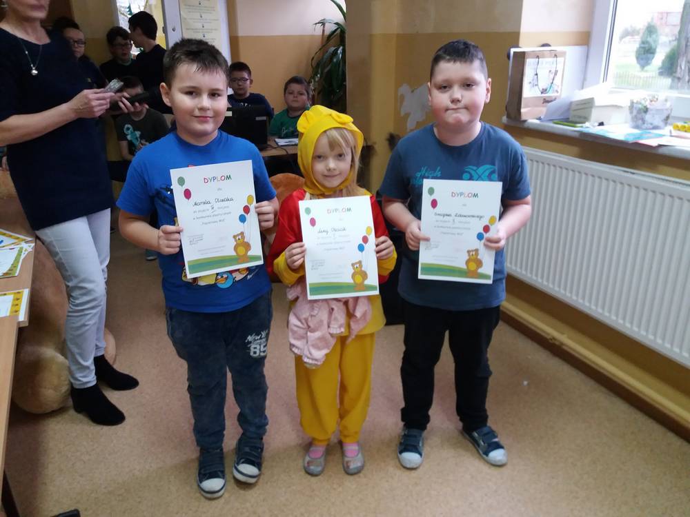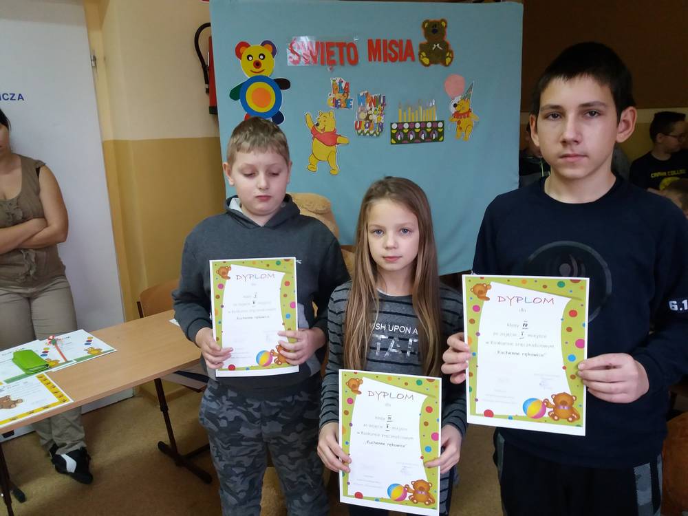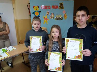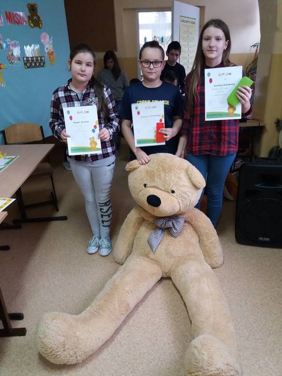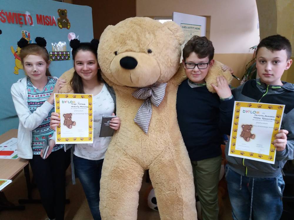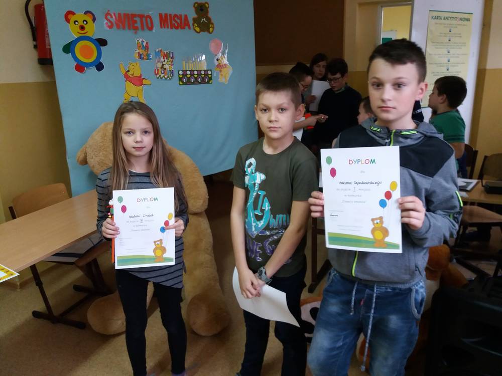25 listopada swoje urodziny od 115 lat obchodzi Pluszowy Miś. W naszej szkole również odbyła się urodzinowa impreza. Uczennice z klas starszych przypomniały historię powstania tej maskotki. Uczniowie każdej klasy przygotowali prezentację swojej maskotki , piosenki i wiersze o misiach. Dzieci z najmłodszych klas wcieliły się w postacie różnych misiów – bajkowych i wymyślonych przez siebie. Wybraliśmy najsympatyczniejszego Misia w szkole, a został nim Filip Majewski z klasy 0. Dzieci uczestniczyły w konkursach plastycznych: ,,Misiowe puzzle”, ,,Papierowy miś”, ,,Narysuj misia z zasłoniętymi oczami”. Była rywalizacja i dużo śmiechu. Odbyły się konkursy sprawnościowe: ,,Wyścig misiów” i ,,Kuchenne rękawice” oraz konkurs dla łakomych misiów ,,Znawcy smaków”. Uczestnicy konkursów otrzymali pamiątkowe dyplomy i drobne nagrody. Urodziny zakończyły się krótką dyskoteką a Miś słodki Krzyś za całusa rozdawał dzieciom cukierki. Następnie dzieci udały się do klas na słodki poczęstunek. Imprezę przygotowała wychowawczyni kl.0 p. Dorota Gralak.