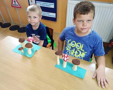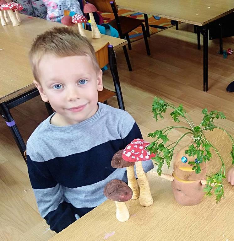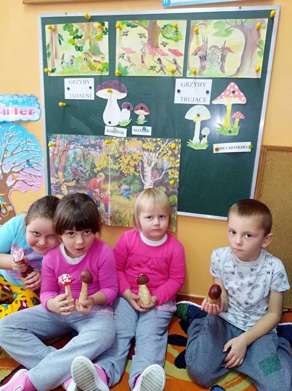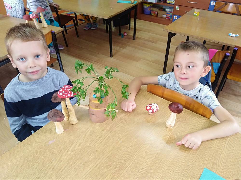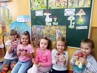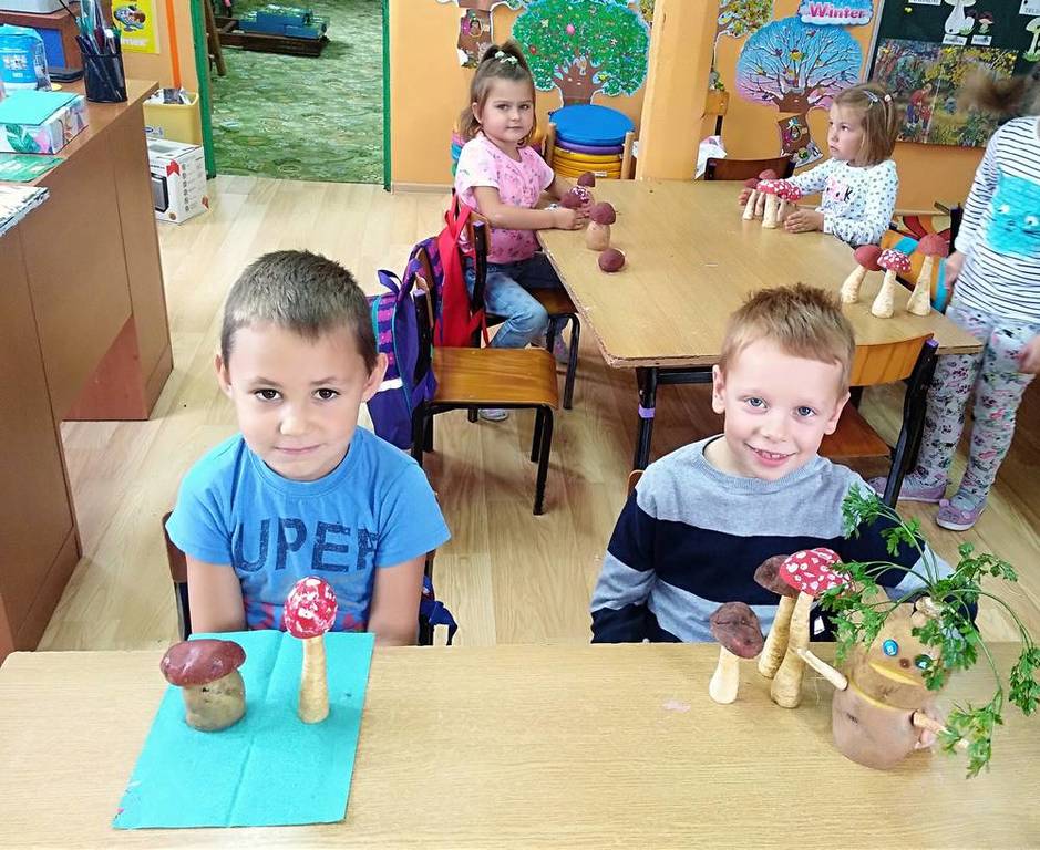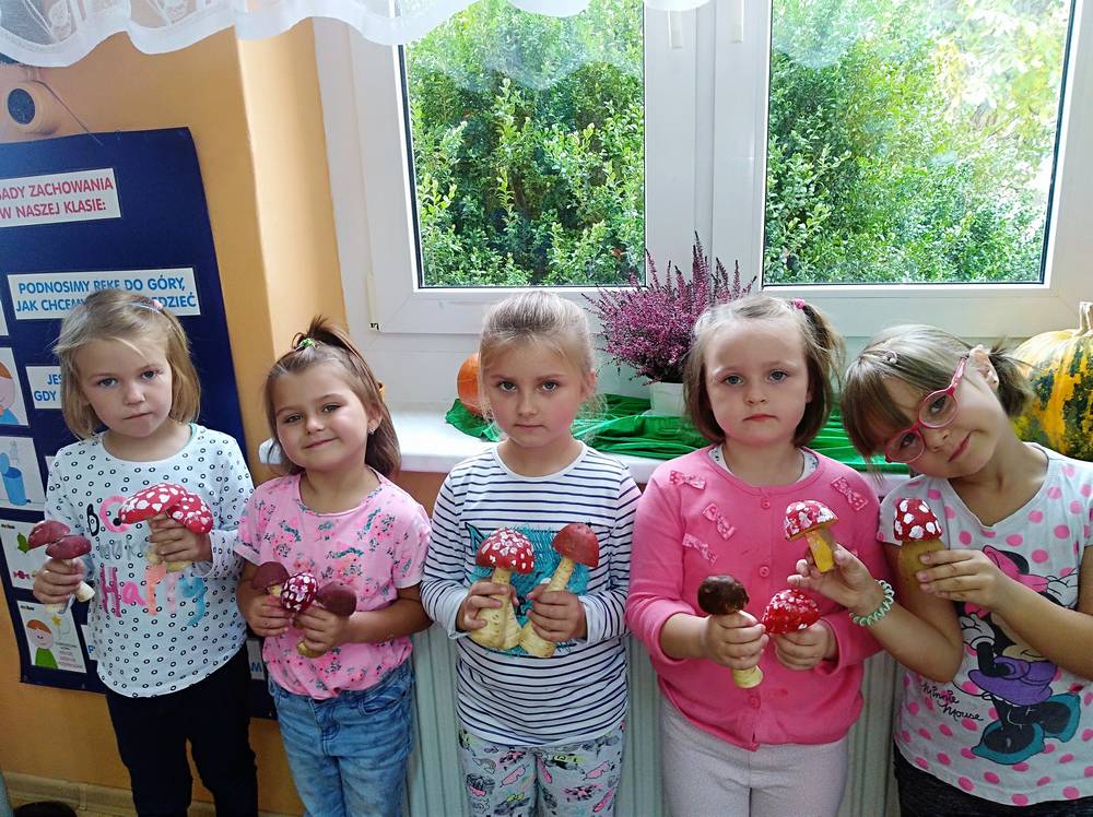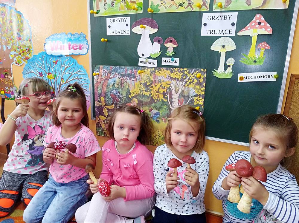 Od kilkunastu dni panuje polska, złota jesień. Przedszkolaki w ramach zajęć edukacyjnych o tematyce jesiennej wykonali przepiękne grzyby. Grzybki wykonano z korzenia pietruszki oraz pomalowanego na brązowo ziemniaczka. Wykonując prace przedszkolaki poznali gatunki grzybów jadalnych oraz niejadalnych. Najmłodszych uświadomono, że nigdy nie wolno samemu zbierać i jeść grzybów, nawet gdy wydają nam się jadalne.