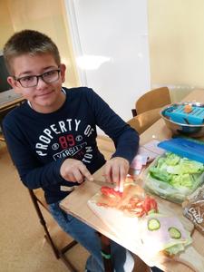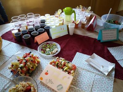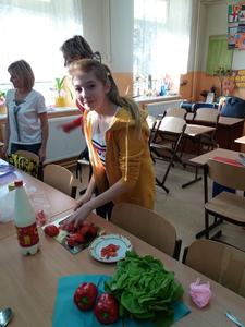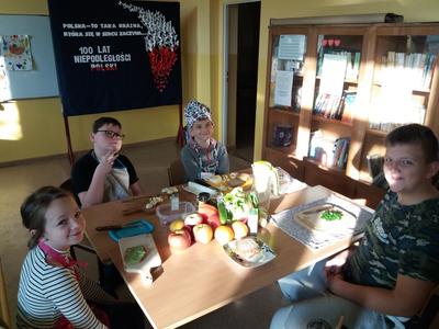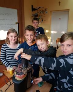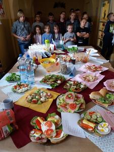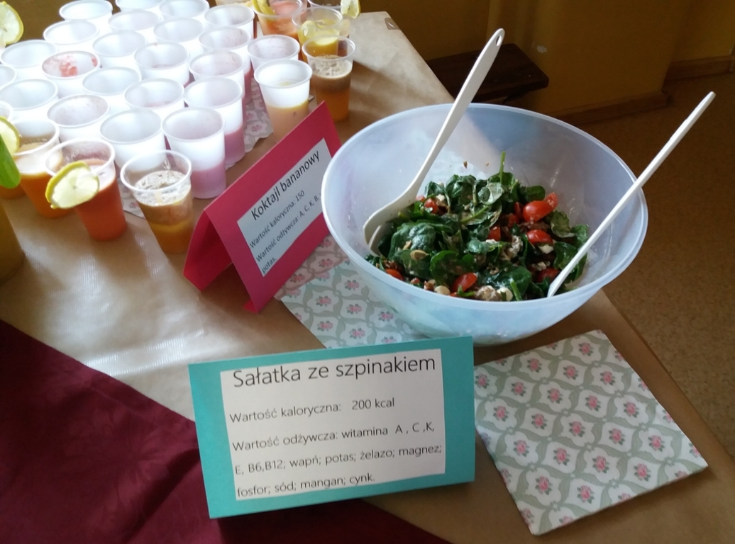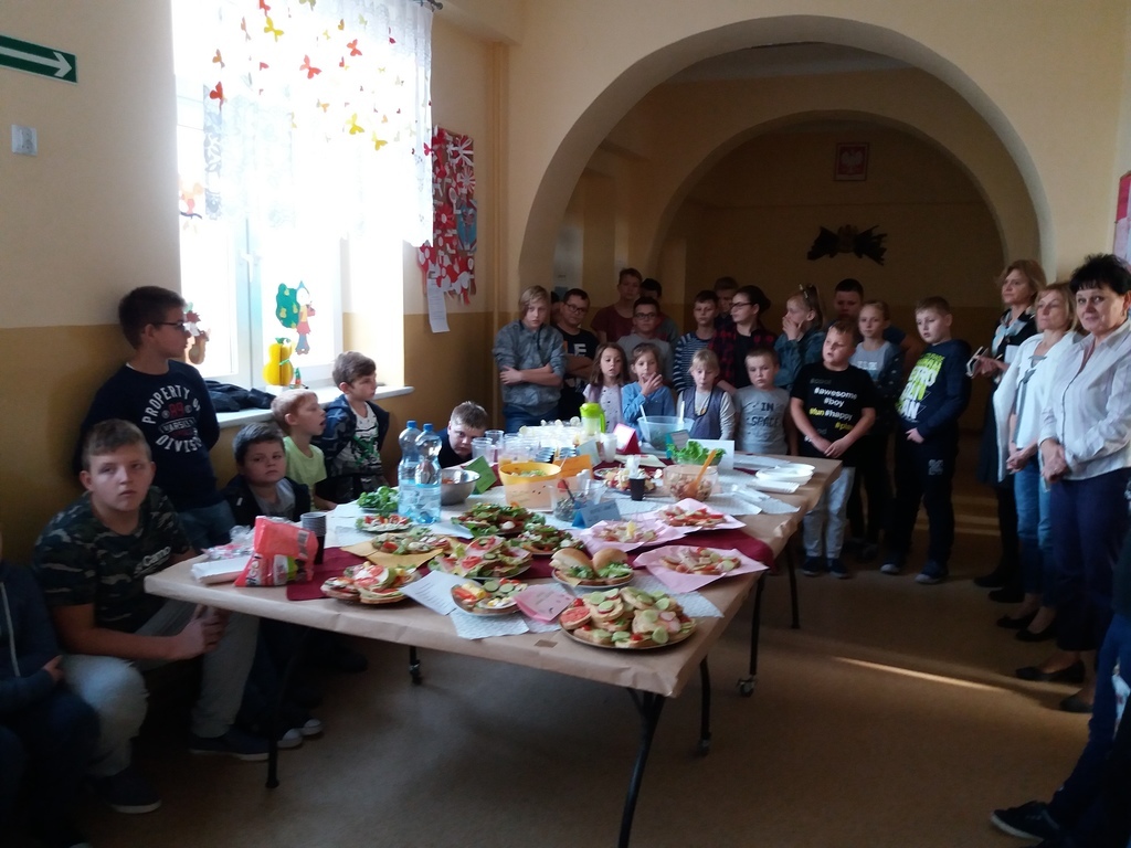 „Jem smacznie, zdrowo i kolorowo” to wiodące hasło tegorocznej akcji promującej zdrowe odżywianie w naszej szkole, która odbyła się 8 listopada. Aby umożliwić uczniom poznanie treści programowych i w ciekawy sposób połączyć je z wesołą zabawą zorganizowany został Dzień Zdrowego Odżywiania przy współudziale wychowawców i p. Sławomiry Przywartej- koordynatora do spraw promocji zdrowia. Tego dnia uczniowie przygotowali smaczne i zdrowe dania śniadaniowe: kanapki, sałatki, koktajle i soki. To był prawdziwy warzywno-owocowy zawrót głowy. Oprócz tego prezentowali walory odżywcze, a klasy starsze dodatkowo przedstawiły ulotki kaloryczne swoich posiłków śniadaniowych. Nie zabrakło także maluchów z klas 0-II. Dzieci wraz ze swoimi wychowawcami przygotowywały zdrowe i smaczne kanapki i soczki w ramach Programu: „Śniadanie daje moc”. W tym dniu został również rozstrzygnięty między klasowy konkurs na wizualizację hasła „Jem smacznie, zdrowo i kolorowo” na gazetkach klasowych. Wszystkie klasy wykazały się niezwykłą pomysłowością, ale 1 miejsce zdobyły klasy: VII i VIII. Ponadto uczennice z klasy VIII: K. Suchodolska i M. Kopańska zaprezentowały ulotkę informacyjną dania kuchni łódzkiej: ”Szare kluchy z kapustą”, którą przygotowały na Wojewódzki Konkurs Kulinarny w ramach projektu. Zwieńczeniem tego dnia było spotkanie przy wspólnym, kolorowym stole oraz wspaniała degustacja przygotowanego śniadania. Dzięki dużej dawce witamin i minerałów wszyscy chętnie wrócili do kolejnych obowiązków szkolnych.