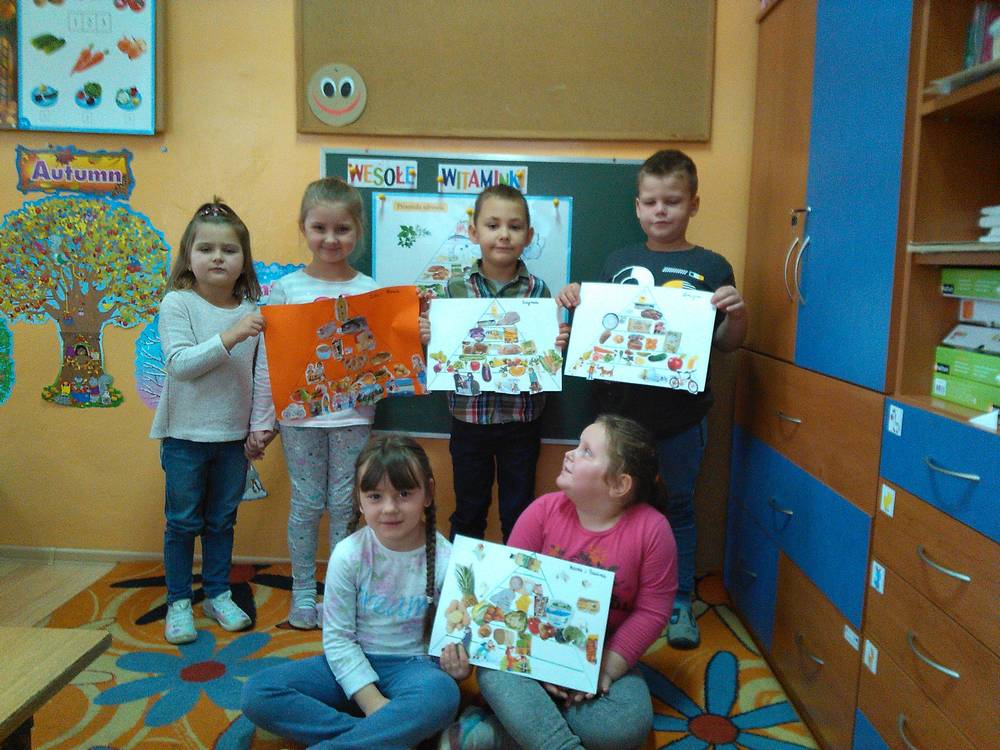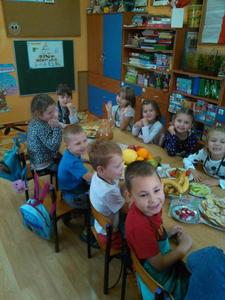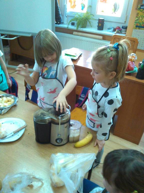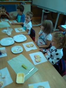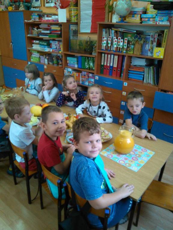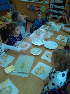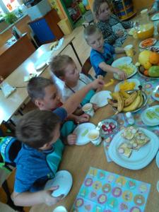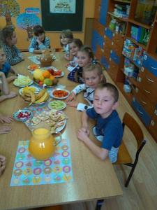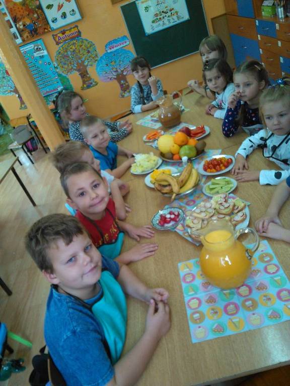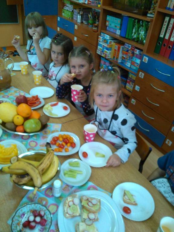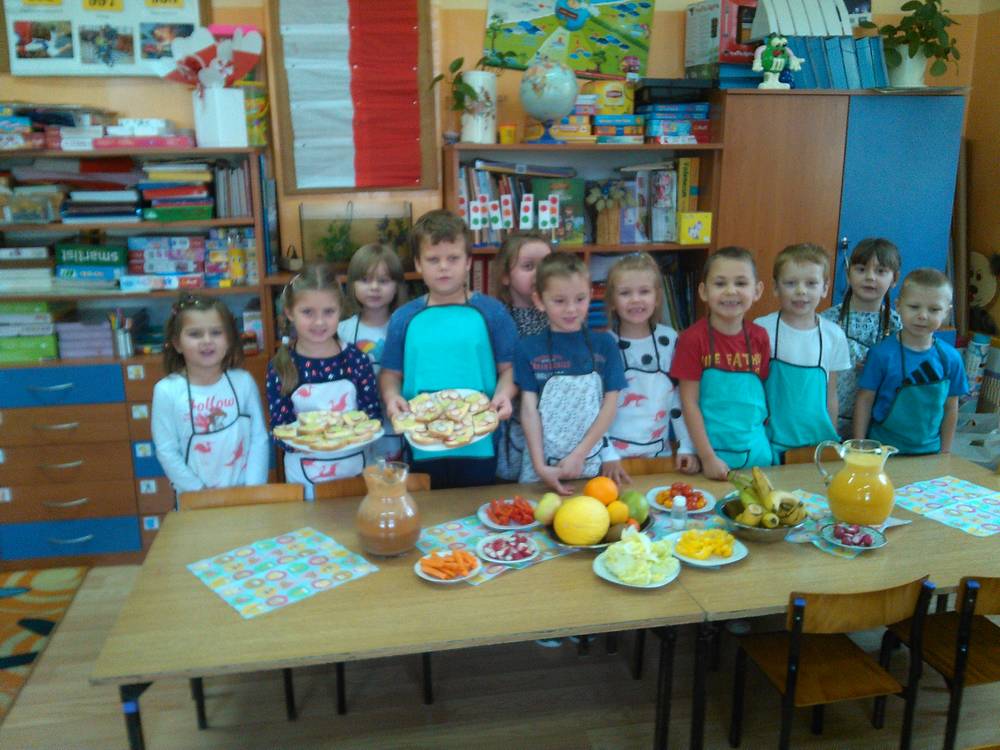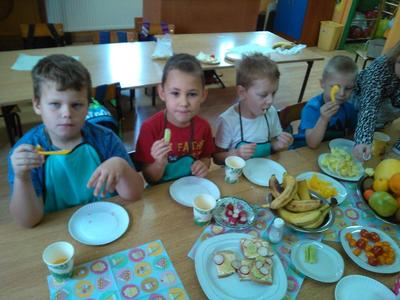 W tym dniu odbyły się zajęcia edukacyjne promujące zdrowy sposób odżywiania się. Dzieci obejrzały prezentację multimedialną, po której odbyła się krótka pogadanka i zajęcia plastyczne. Dzieci wykonały plakat-piramidę zdrowia oraz wesołe emotikonki warzyw i owoców. Następnie przygotowały zdrowe śniadanie. Pod opieką swojej wychowawczyni p. Doroty Gralak robiły kanapki, soki z owoców i owocowo-warzywne przekąski. Maluchy nakryły pięknie stoliki a później odbyła się wspólna konsumpcja przygotowanego śniadania. Było smacznie, zdrowo i kolorowo.