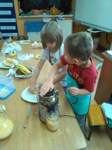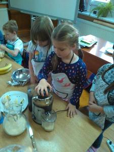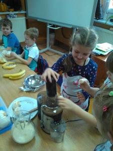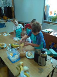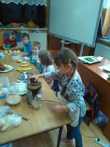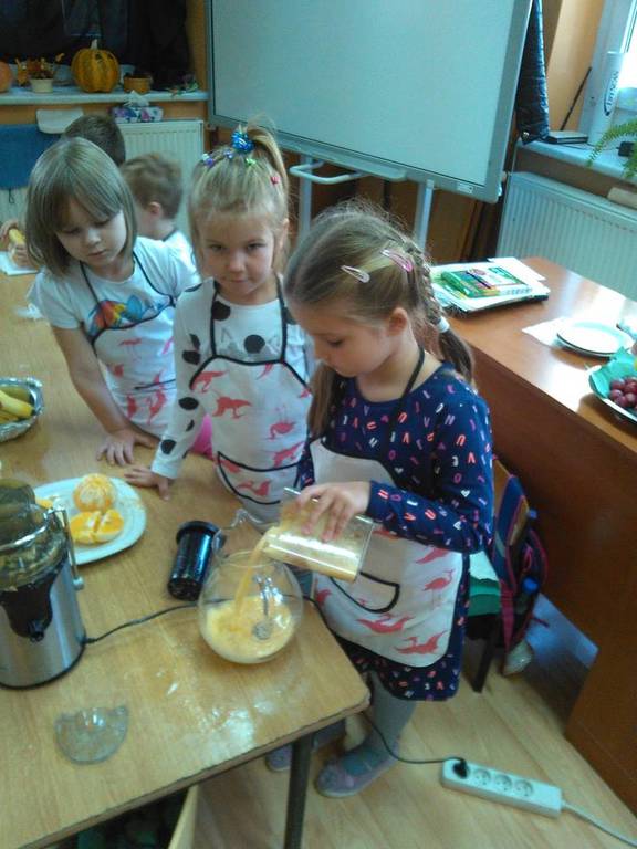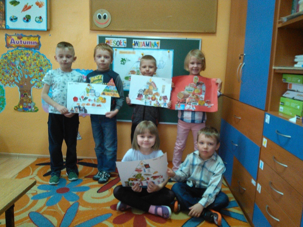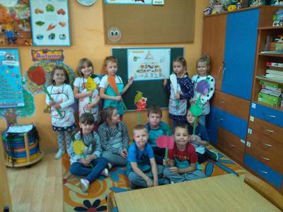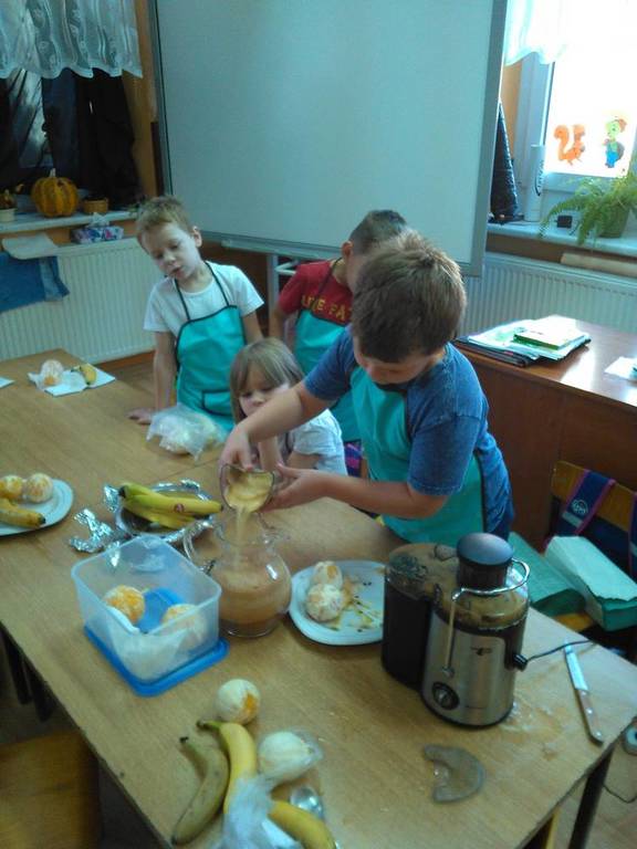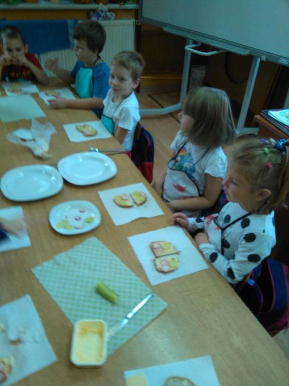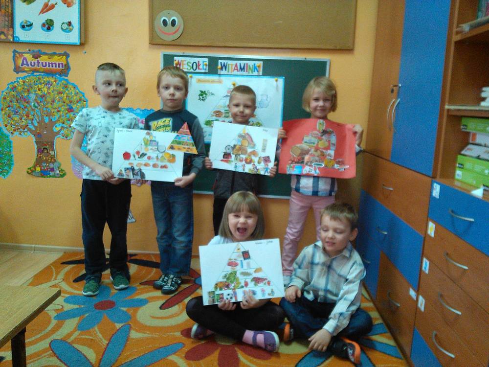 W tym dniu odbyły się zajęcia edukacyjne promujące zdrowy sposób odżywiania się. Dzieci obejrzały prezentację multimedialną, po której odbyła się krótka pogadanka i zajęcia plastyczne. Dzieci wykonały plakat-piramidę zdrowia oraz wesołe emotikonki warzyw i owoców. Następnie przygotowały zdrowe śniadanie. Pod opieką swojej wychowawczyni p. Doroty Gralak robiły kanapki, soki z owoców i owocowo-warzywne przekąski. Maluchy nakryły pięknie stoliki a później odbyła się wspólna konsumpcja przygotowanego śniadania. Było smacznie, zdrowo i kolorowo.