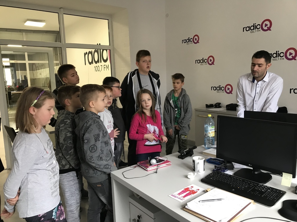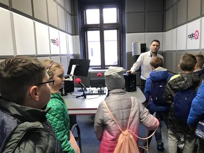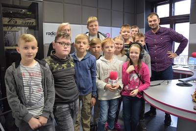 Kolejne wrażenia czekały na dzieci w studiu Radia Q. Na miejscu przywitał ich kierownik marketingu p. Konrad Sobczyk. Najciekawszym Dzieci mogły zwiedzić studio nagrań, obserwować audycję nadawaną na żywo oraz pozdrowić na antenie rodzinę, znajomych oraz nauczycieli ze szkoły. Następnym punktem wycieczki było zwiedzanie działu redakcyjnego, gdzie dziennikarze przygotowują audycje oraz ustalają terminy swoich zajęć. Wycieczka zakończyła się wspólnym zdjęciem pamiątkowym. Wszyscy byli bardzo zadowoleni i z entuzjazmem wychodzili z rozgłośni. Na zakończenie wizyty w Kutnie dzieci wraz z opiekunami udały się do pizzerii na ciepły posiłek.