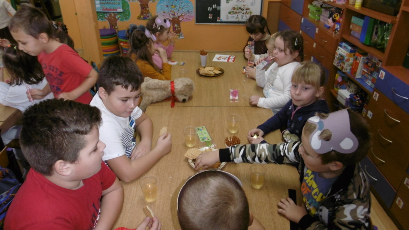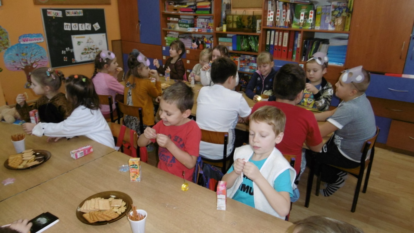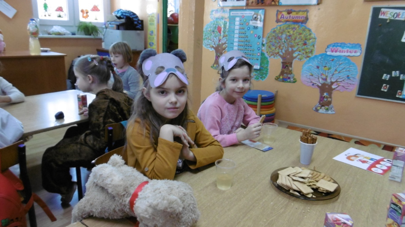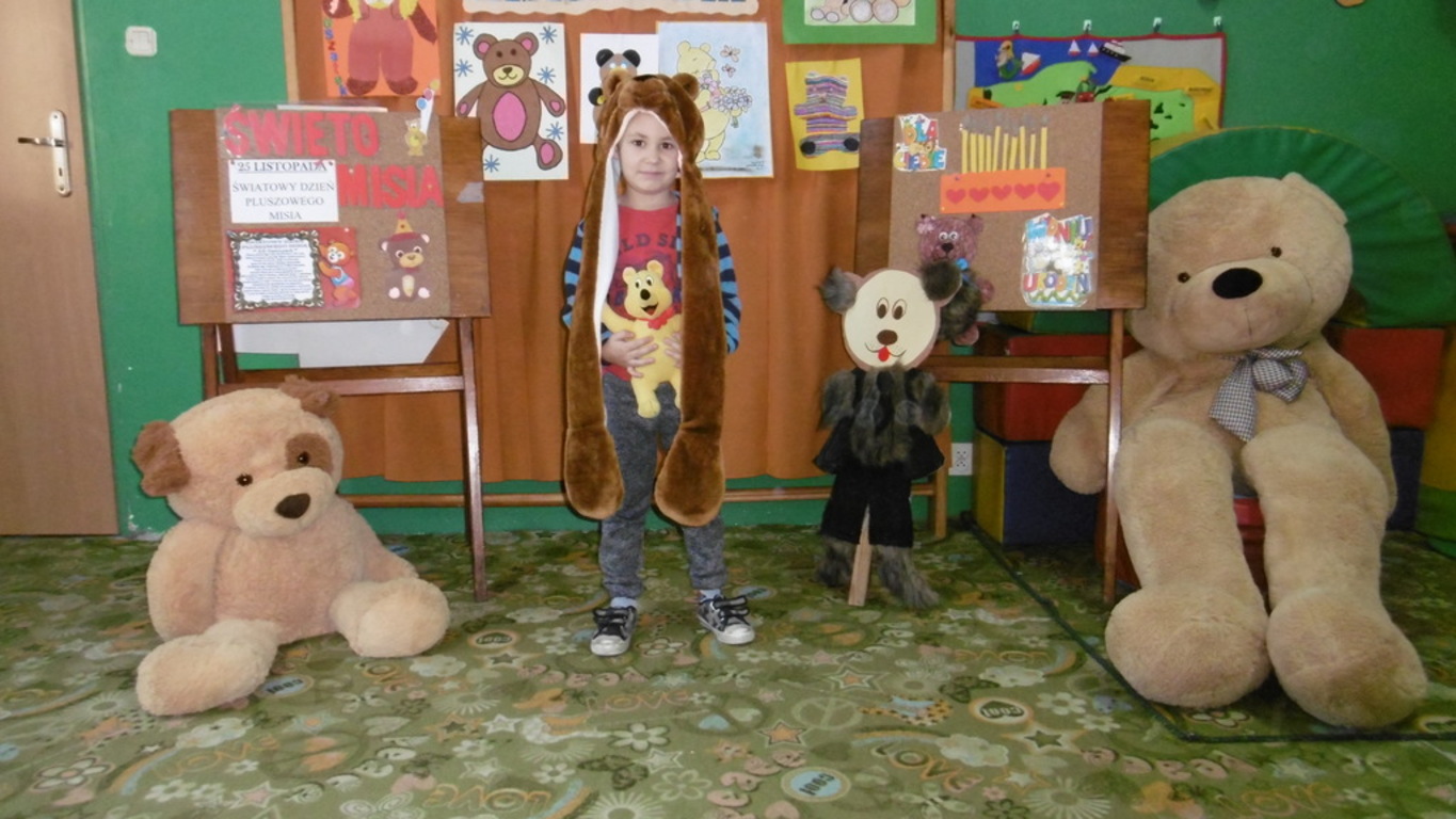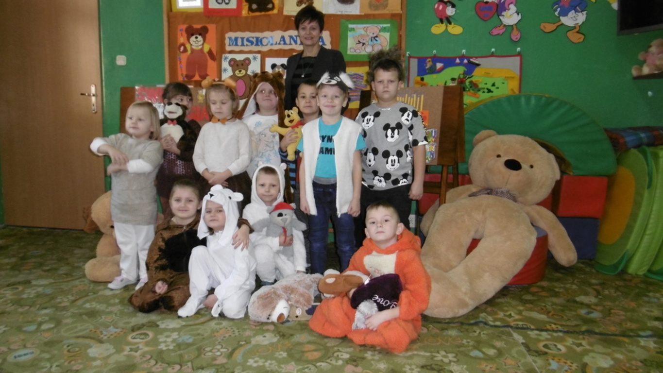 29.11.2018 roku świętowaliśmy kolejne urodziny tej przesympatycznej maskotki. W tym dniu każde dziecko przyszło ze swoim ulubionym pluszowym misiem, a niektórzy sami zamienili się w pluszowe postacie. Zabawę rozpoczęliśmy od zgaduj-zgaduli – ,,Co lubią jeść Misie”, odbyła się loteria fantowa i różne konkursy:,, Łakome misie”, ,,Wyścigi misiów”. Jak przystało na urodziny nie obyło się bez słodkiego poczęstunku – ciasteczka i sok owocowy wzmocniły wszystkich uczestników zabawy. Naszą zabawę zakończyło rozstrzygnięcie konkursu plastycznego ,,Mój ulubiony miś”. Wszyscy uczestnicy otrzymali pamiątkowe dyplomy i drobne nagrody rzeczowe. Dzień upłynął w miłej i wesołej atmosferze.