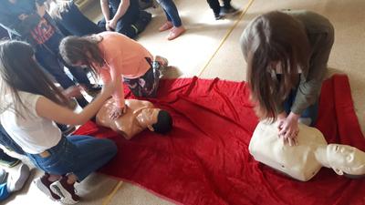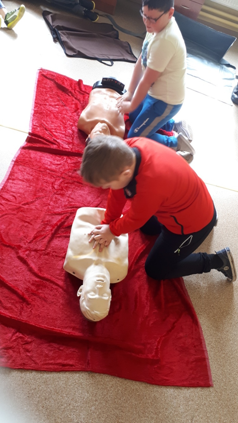 Warsztaty obejmowały poznawanie przez uczniów wszystkich etapów pomocy czyli: własne bezpieczeństwo, wołanie o pomoc, sprawdzanie przytomności i oddechu, wzywanie pomocy – służby ratownicze 112, 999…, układanie poszkodowanego w pozycji bocznej ustalonej (bezpiecznej), wykonywanie wdechów ratowniczych, ucisków klatki piersiowej (masaż serca).
