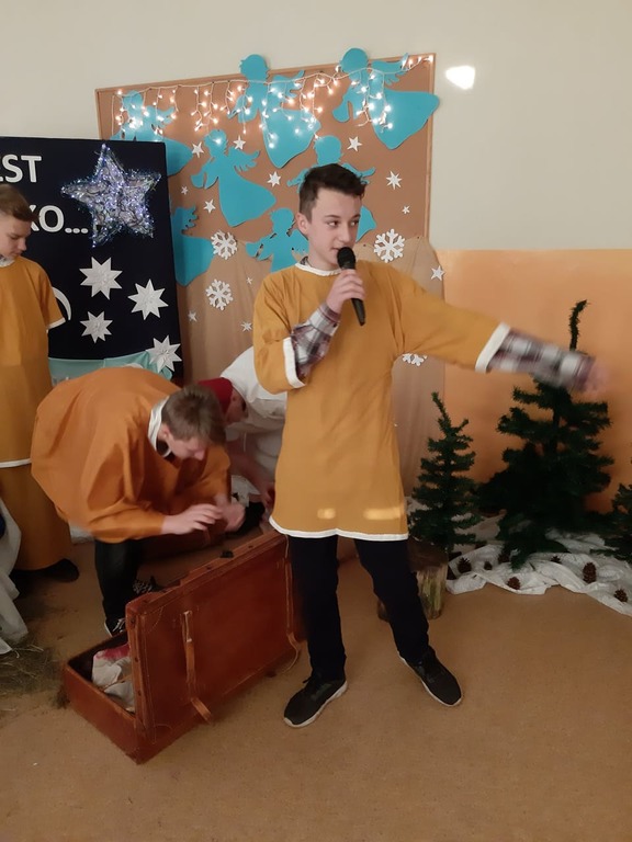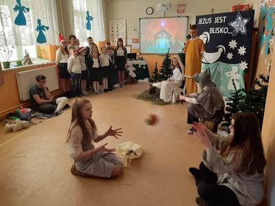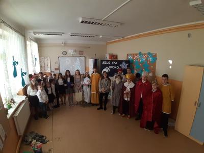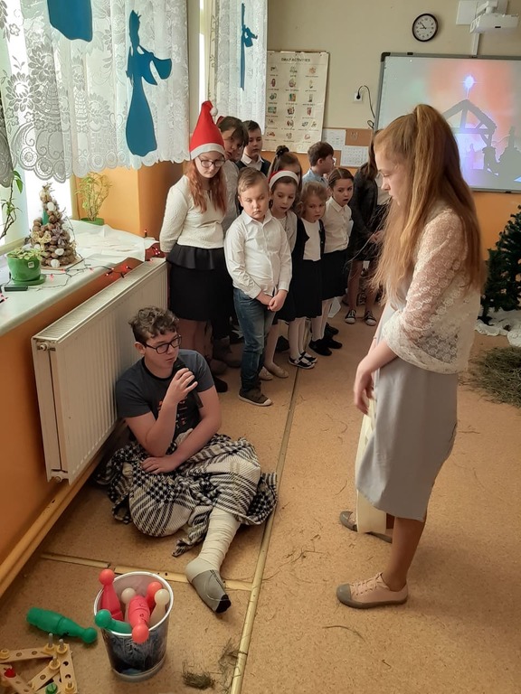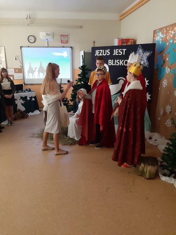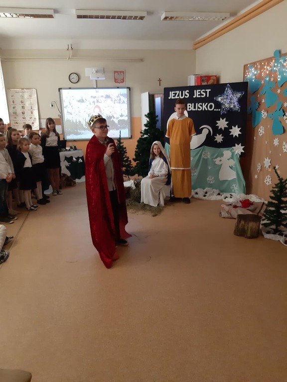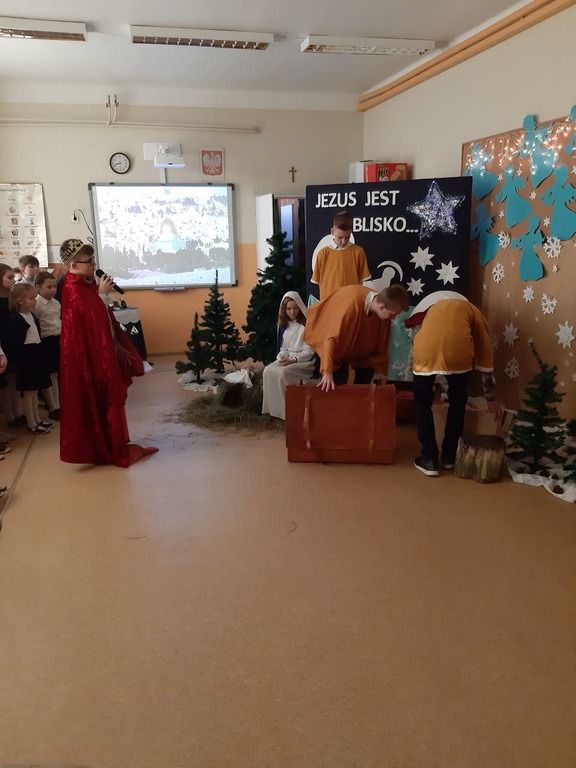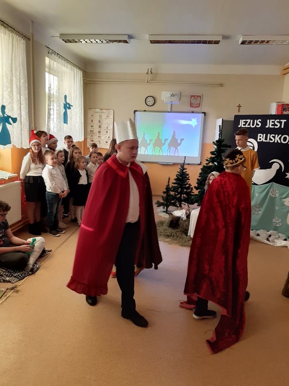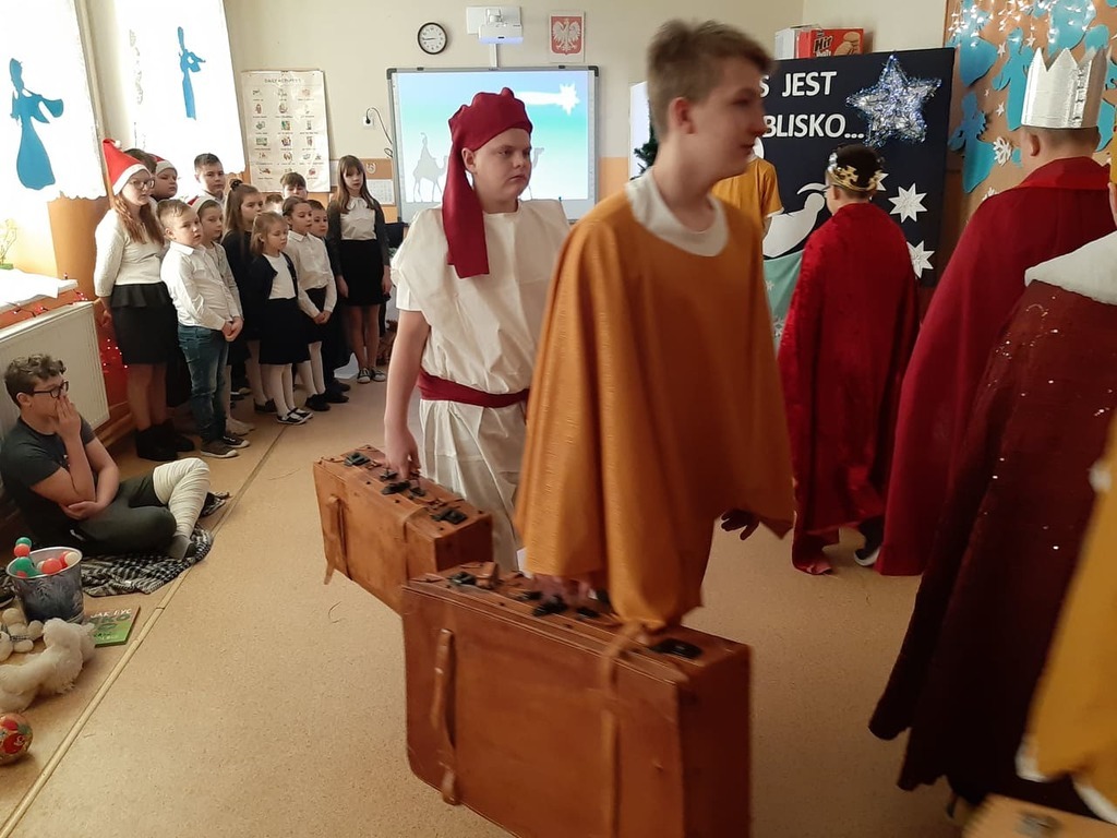 20 grudnia odbyły się w naszej szkole uroczyste jasełka. Przedstawienie świąteczne przygotowali uczniowie klas 7-8 pod opieką pani Edyty Rożnowskiej. Oprawę muzyczną przygotowała Pani Lila Siedlecka, zaś w tworzeniu pięknej dekoracji wspierały Panie Małgorzata Ambroziak oraz Patrycja Szlauderbach. Uczniowie odgrywając sceny, zwiazane z wydarzeniami narodzin Chrystusa, nie tylko przybliżyli nam magię tej wyjątkowej nocy, ale także zwrócili nasza uwagę na ludzi biednych oraz pokrzywdzonych przez los. Ukazali swoja postawą, że w tym ważnym dla chrześcijan czasie powinniśmy pamiętać o każdym człowieku, bez względu na wiek, rasę, czy stan majątkowy. Jasełka uświetnili swoją obecnoscią goście: Pani Wojt Gminy Kutno Justyna Jasińska, Radny Jerzy Kostrzewa oraz Ksiądz Proboszcz Krzysztof Kuśmirek. Po występie małych aktorów, uczniowie obdarowali światecznymi prezentami przybyłych gości, zaś Pani Wójt złożyła wszystkim piękne życzenia nawiązujące do obejrzanego przedstawienia. Spotkanie zakończyło się wspólnym opłatkiem.