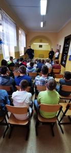 Funkcjonariusze przestrzegali przed zagrożeniami jakie mogą ich spotkać w czasie zabaw na śniegu i lodzie. Mówili o niebezpieczeństwie zjazdów sankami w okolicach dróg, zbiorników wodnych, wchodzenia na zamarznięte akweny wodne. Prosili o zachowanie szczególnej ostrożności podczas poruszania się po drogach publicznych po zmroku i przekonywali uczniów o tym, że noszenie odblasków wpływa na poprawę bezpieczeństwa. Dzieci, które pozostają w domach zostały poinformowane o konieczności zamykania drzwi i zakazie wpuszczania osób nieznajomych. Na koniec nasz gość życzył wszystkim udanych i bezpiecznych ferii.