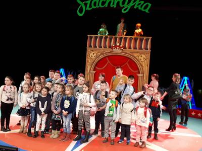 Dnia 21 lutego dzieci z naszej szkoły i przedszkola wybrały się na wycieczkę do Teatru w Płocku, aby obejrzeć spektakl pt.: „Pchła szachrajka”. To bajka adresowana przede wszystkim do najmłodszych widzów. Jest to jedna z tych fenomenalnych, wciąż aktualnych i rozbawiających zarówno tego małego, jak i dużego czytelnika bajek Jana Brzechwy. Przewrotny, pełen inteligentnego humoru i niecodziennego dowcipu spektakl, opatrzony cudownymi, barwnymi scenami, zachwycił każdego malucha.