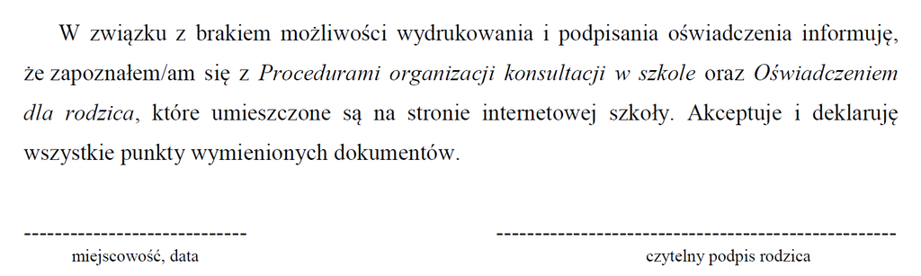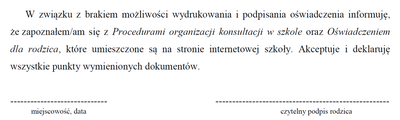 Prosimy o zapoznanie się z procedurami organizacji konsultacji w naszej szkole. Uczniowie chcący wziąć udział w konsultacjach muszą mieć ze sobą podpisane przez rodzica oświadczenie.