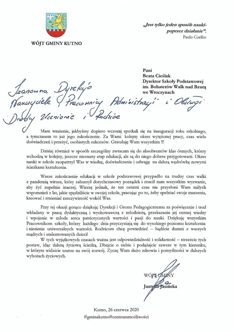 Rok szkolny 2019/2020 właśnie dobiegł końca. Był on wyjątkowy i inny niż wszystkie do tej pory ze względu na panującą od marca pandemię koronawirusa i obowiązującą naukę zdalną. Ze względu na obecną sytuację epidemiczną nie udało się zorganizować wspólnego, uroczystego zakończenia roku szkolnego, a odbiór świadectw promocyjnych, nagród i dyplomów za osiągnięcia w nauce odbył się według ustalonego harmonogramu oraz z zachowaniem reżimu sanitarnego i wytycznych GIS. Był to również dzień pożegnania z naszymi ósmoklasistami, którzy stali się absolwentami szkoły. Justyna Jasińska, Wójt Gminy Kutno przekazała okolicznościowy list adresowany dla nauczycieli, pracowników administracji i obsługi oraz uczniów i rodziców oraz piękne upominki dla absolwentów. Uczniowie z najwyższą średnią otrzymali stypendium naukowe od Wójta Gminy Kutno. Nie zabrakło również nagród sportowych ufundowanych przez organ prowadzący dla osób, które brały udział w zawodach sportowych. Wszystkim Uczniom Pani Wójt życzyła bezpiecznych i spokojnych wakacji.