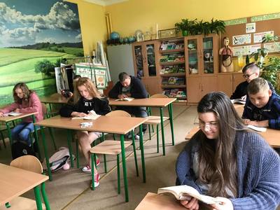 Wspólne czytanie zorganizowała pani Marzena Majtczak, która zmotywowała uczniów do głośnego, pięknego odczytania fragmentów dramatu. Podczas spotkania nauczycielka podzieliła się z uczestnikami wiedzą na temat genezy utworu, głównych wątków oraz bohaterów. Przygotowana została również gazetka tematyczna oraz prezentacja multimedialna.