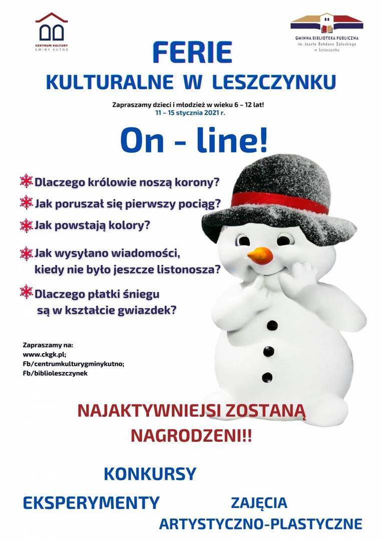 Centrum Kultury Gminy Kutno wraz z Gminną Biblioteką Publiczną im. Józefa Bohdana Zaleskiego przygotowało „Kulturalne ferie w Leszczynku on-line", które odbędą się w dniach od 11 do 15 stycznia 2021 r.