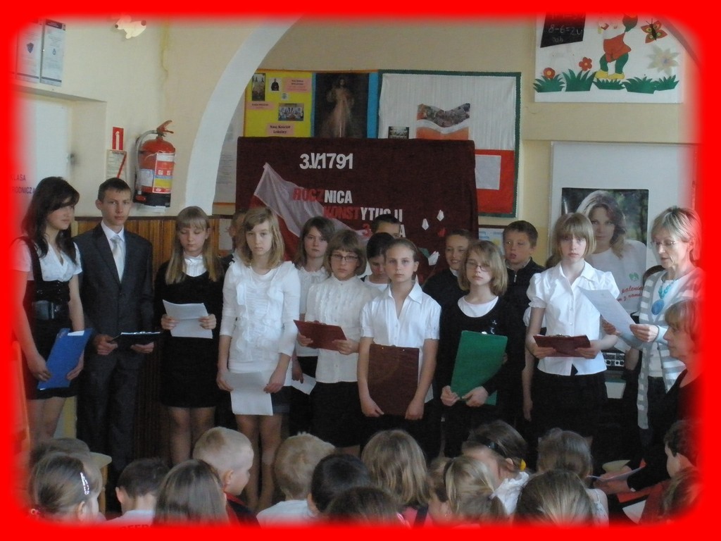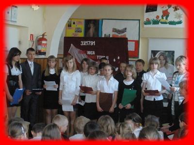 Uczniowie naszej szkoły upamiętnili 221 rocznicę Konstytucji 3- go maja. Obchodzone 3 maja Narodowe Święto Konstytucji to najbardziej radosny i uroczysty dzień. Uchwaleniem ustawy zasadniczej w 1791r. wyprzedziliśmy inne kraje Europy, pokazaliśmy, że można się wznieść na wyżyny nowoczesnego, oświeceniowego ustawodawstwa. Te fakty uczniowie przypomnieli w częśći artystycznej, zaśpiewali pieśni patriotyczne, recytowali wiersze w podniosłej atmosferze. Akademię zakończyła Karolina Pietrzak (kl IV) odczytaniem informacji biograficznych o Januszu Korczaku. Ogłoszono wyniki szkolnego konkursu poświęconego działalności społecznej i artystycznej J.Korczaka. Nagrody książkowe otrzymali Zuzanna Florczak (kl. V), Cezary Florczak (kl. VI), Mateusz Pawlak (kl.VI) i Rozalia Ratajczyk (kl. IV), a pozostali uczestnicy otrzymali nagrody pocieszenia.