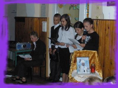 Miesiąc maj szczególnie wyraźnie przypomina nam postać Karola WOjtyły z Wadowic: minęła pierwsza rocznica beatyfikacji, 13 maja powrócą smutne wspomnienia zamachu na życie Ojca Świętego, a 18 maja miną 92 lata od dnia narodzin małego Lolka, jak go wówczas nazywano. Dlatego też w naszej szkole w dniu 9 maja 2012r. odbył się apel poświęcony osobie niezwykłej, wielkiemu Polakowi - błogosławionemu Janowi Pawłowi II. Gościem honorowym był ks. proboszcz Krzysztof Kuśmirek, który podzielił się z nami wspomnieniami ze spotkań z papieżem oraz wręczył nagrody uczestnikom konkursu o życiu Jana Pawła II.
