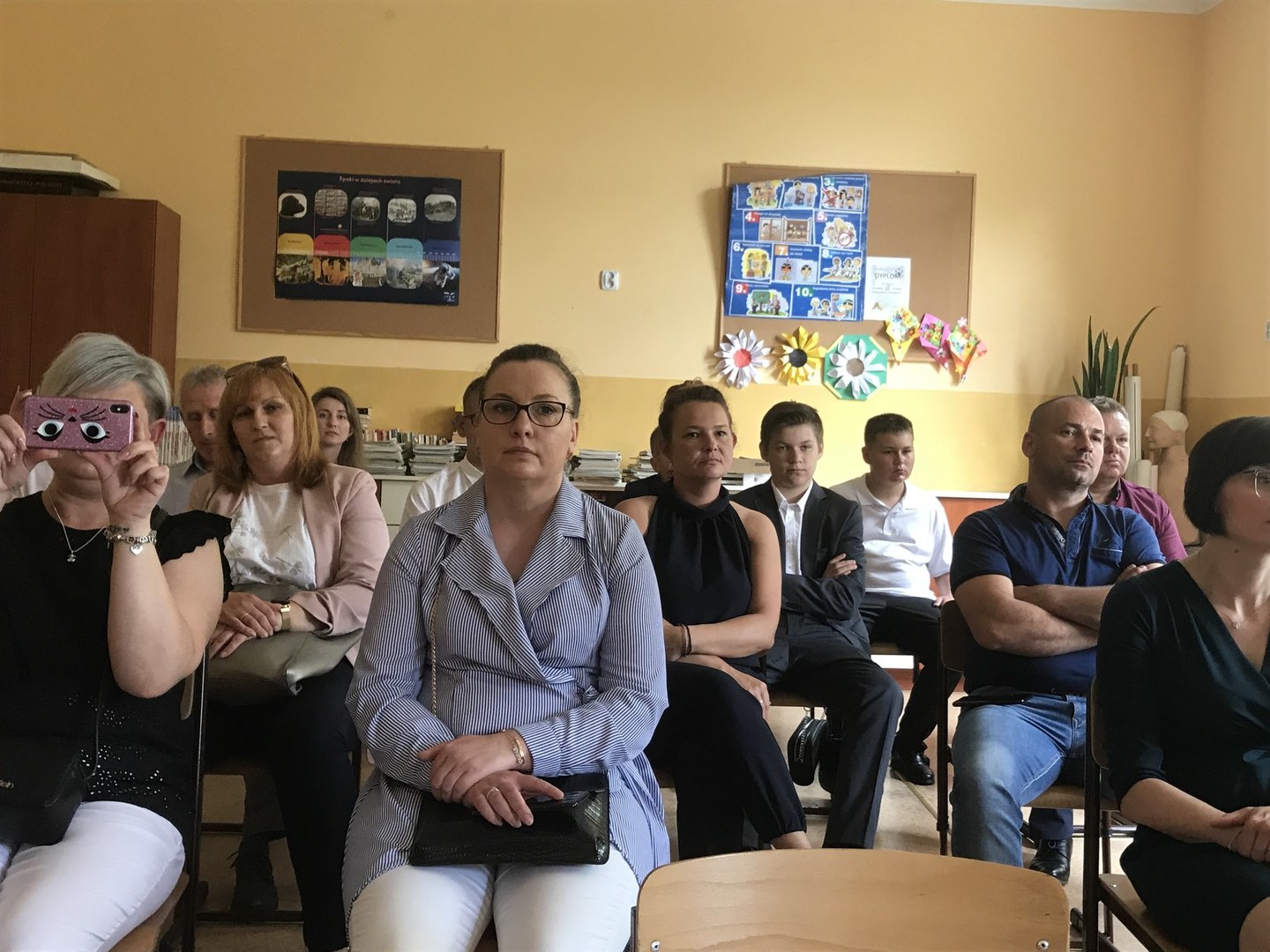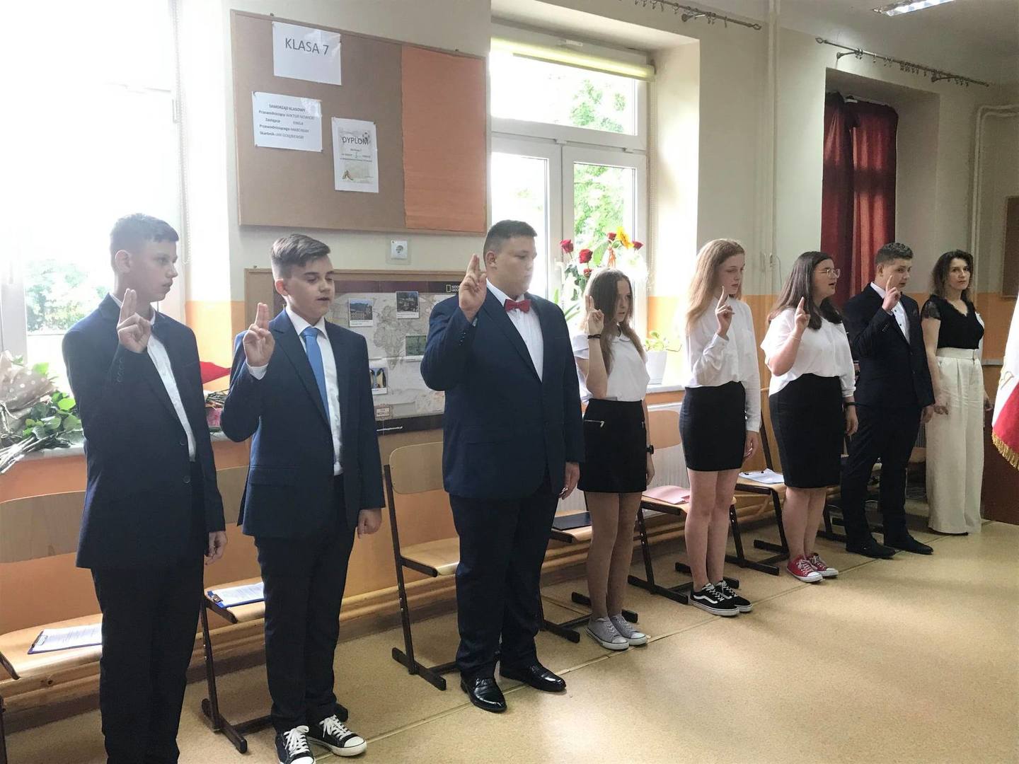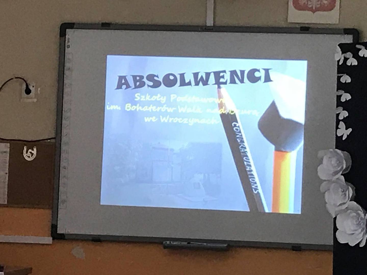 Uczniowie klasy ósmej przedstawili program słowno – muzyczny, następnie wyświetlona została prezentacja multimedialna z wydarzeń szkolnych z ich udziałem. Przedstawiciele klasy VII na pożegnanie swoim starszym kolegom wręczyli drobne upominki. Absolwenci ze wzruszeniem pożegnali wychowawcę klasy – Panią Annę Nyckowską.
