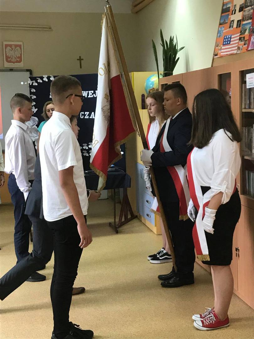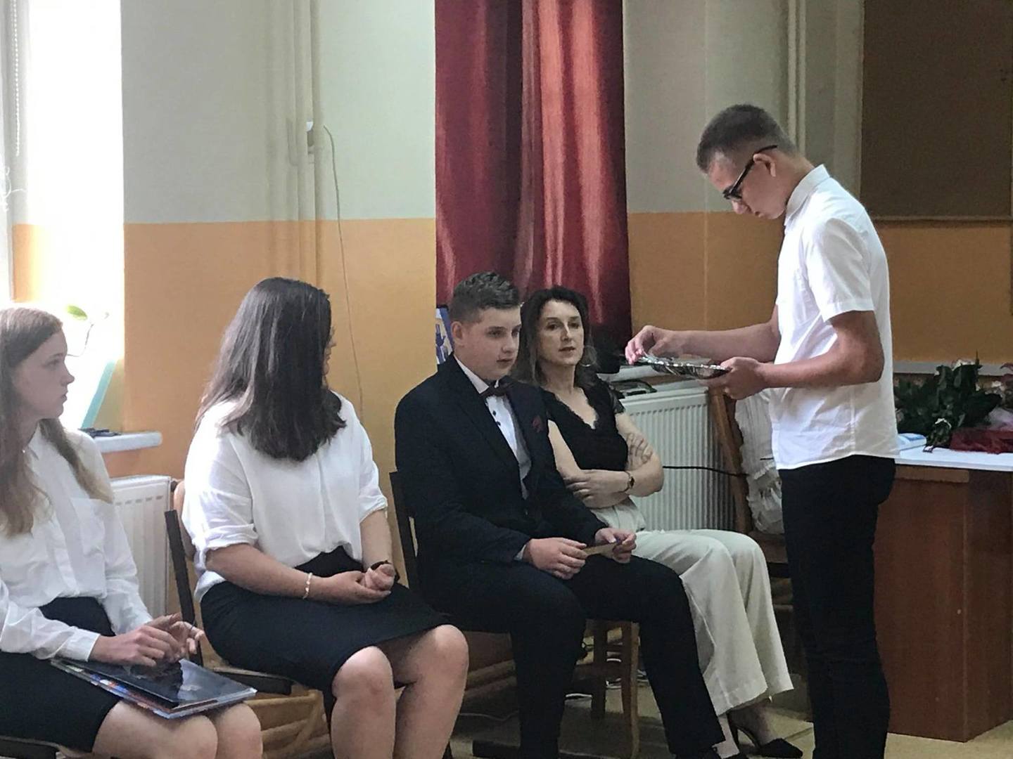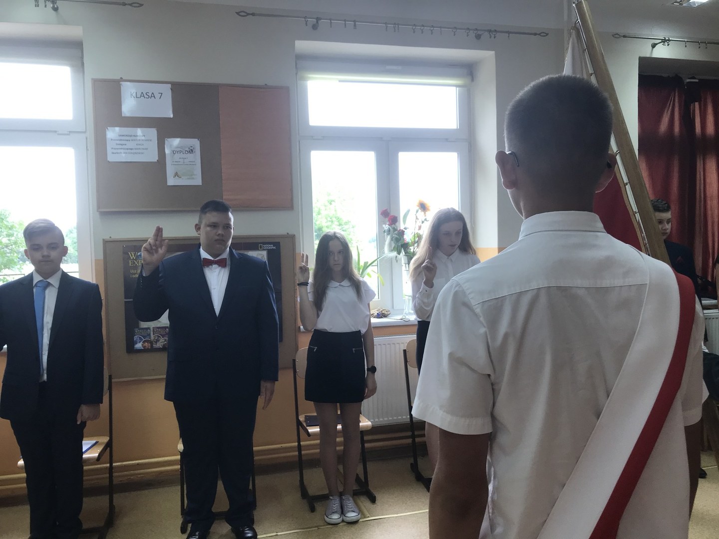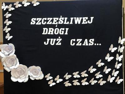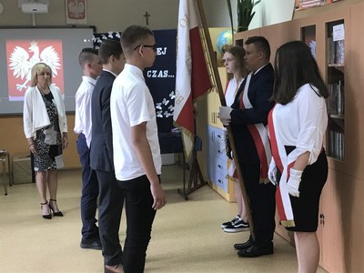 Uczniowie klasy ósmej przedstawili program słowno – muzyczny, następnie wyświetlona została prezentacja multimedialna z wydarzeń szkolnych z ich udziałem. Przedstawiciele klasy VII na pożegnanie swoim starszym kolegom wręczyli drobne upominki. Absolwenci ze wzruszeniem pożegnali wychowawcę klasy – Panią Annę Nyckowską.