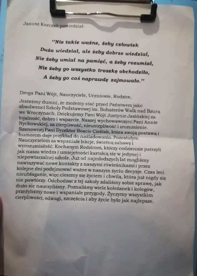 - Drodzy Uczniowie, jesteście już Absolwentami Szkoły Podstawowej we Wroczynach. Dziękuję Wam za godne reprezentowanie naszej szkoły. Pożegnania są zawsze trudne, zwłaszcza gdy żegnają się ludzie, którzy przez kilka lata tworzyli jedną wielką szkolną rodzinę. Trudno uwierzyć, że te lata minęły tak szybko, pamiętamy doskonale pierwsze dni waszej nauki w szkole, blaski i cienie codziennych zmagań na zajęciach, wspólne imprezy ,wyjazdy, zabawy. Wspólnie przeżywaliśmy chwile sukcesów, słabości, porażek. Ale cóż coś się kończy, aby zaczęło się coś innego, czekają was nowe wyzwania, i coraz bardziej dorosły świat. Życzę Wam samych sukcesów, mądrych wyborów, realizacji pasji i zainteresowań – mówiła.