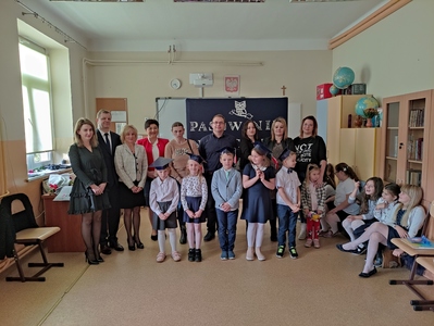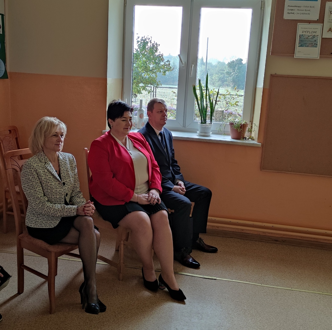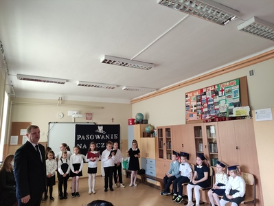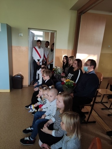 Na uroczystość przybyli zaproszeni goście - Wójt Gminy Kutno Justyna Jasińska, Dyrektor Centrum Usług Wspólnych Robert Witczak, nauczyciele i rodzice uczniów klasy pierwszej.