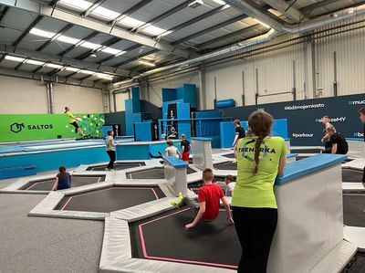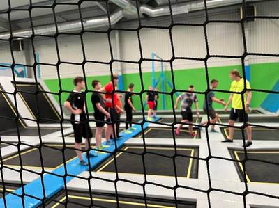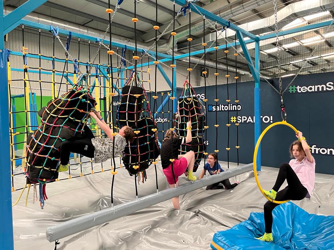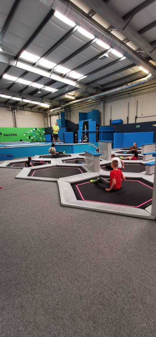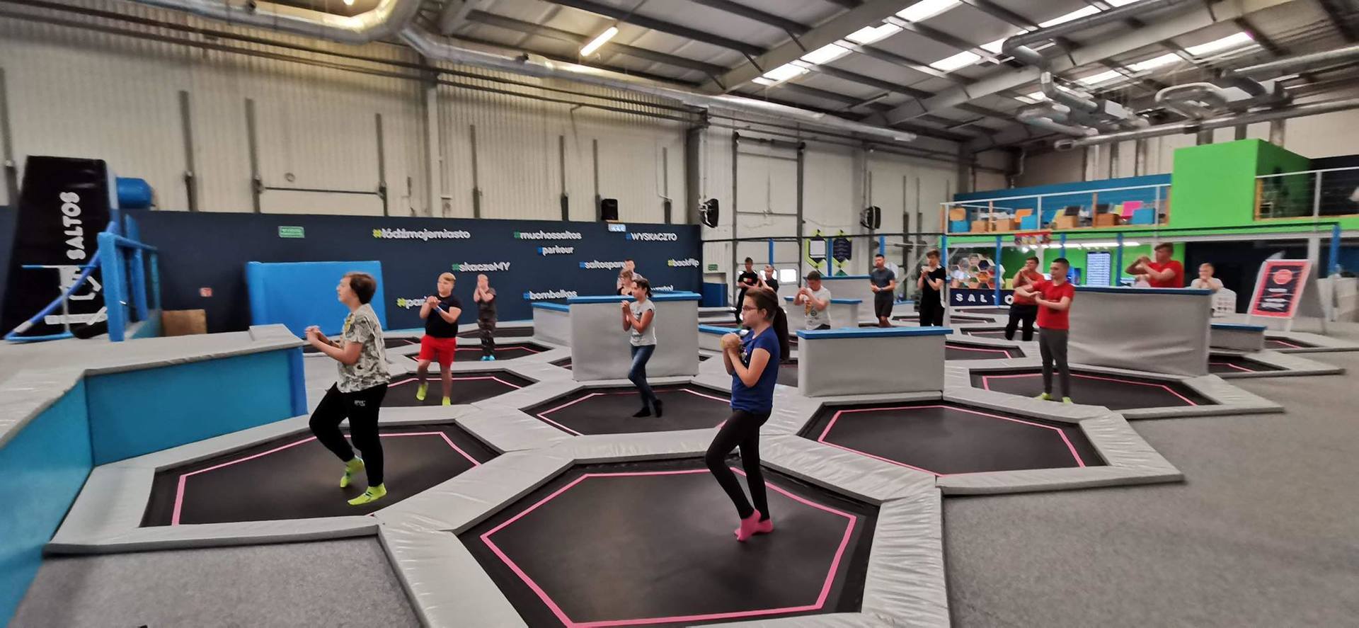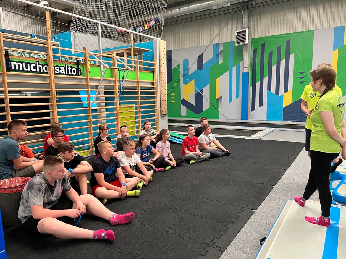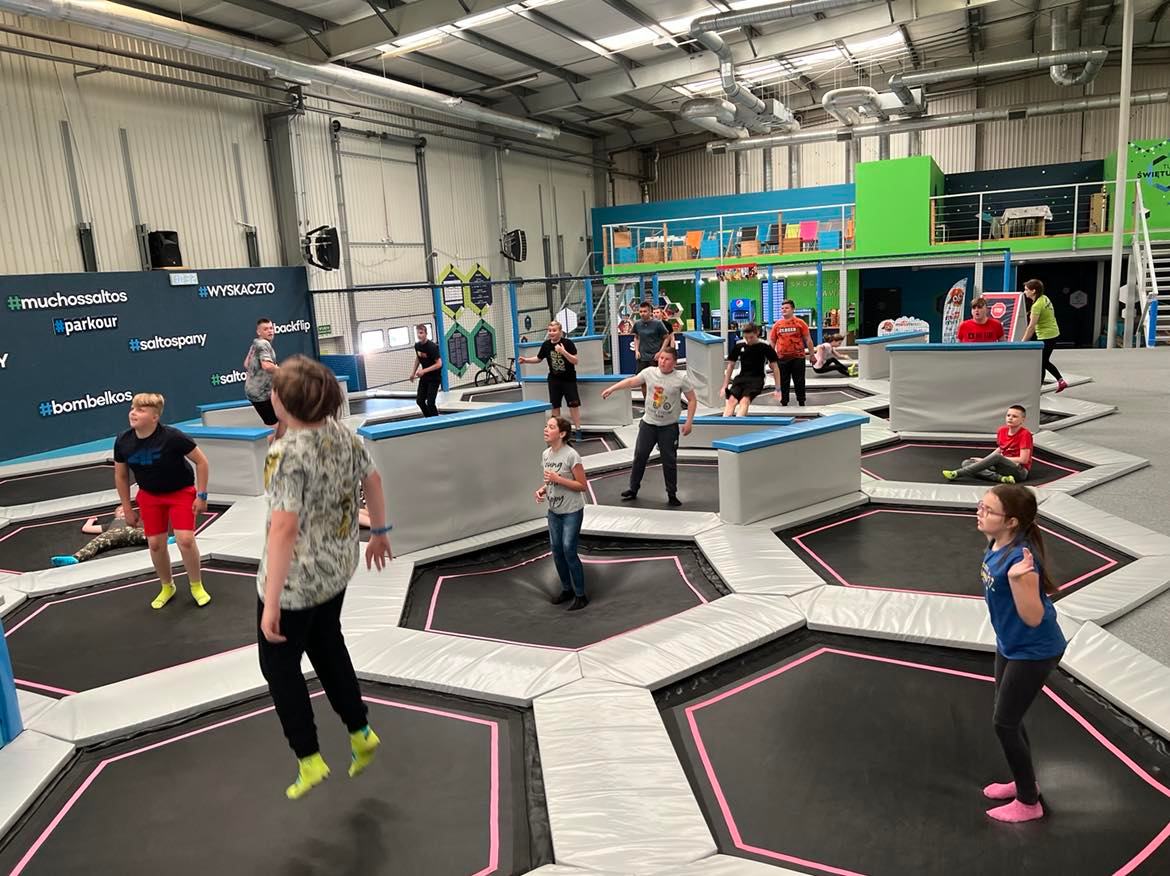 W programie wycieczki znalazły się najpierw zajęcia sportowe w parku trampolin „Saltos”. Uczniowie podzieleni na dwie grupy zamiennie uczestniczyli w poszczególnych zajęciach. W parku trampolin młodzi adepci na początku poznali podstawowe zasady bezpieczeństwa i prawidłowego korzystanie z trampolin. Następnie po krótkiej i dynamicznej rozgrzewce pod okiem instruktorów chłopcy i dziewczęta wykonywali skoki, kontrolowane upadki, podniebne akrobacje, a nawet salta w przód. Ponadto uczniowie podzieleni na małe grupy korzystali z trampolin sportowych, wykonywali skoki do basenu z piankami, korzystali z toru przeszkód nad basenem piankowym oraz grali w „zbijaka”. Zajęcia na trampolinach miały charakter zajęć wychowania fizycznego i były prowadzone przez instruktorów.