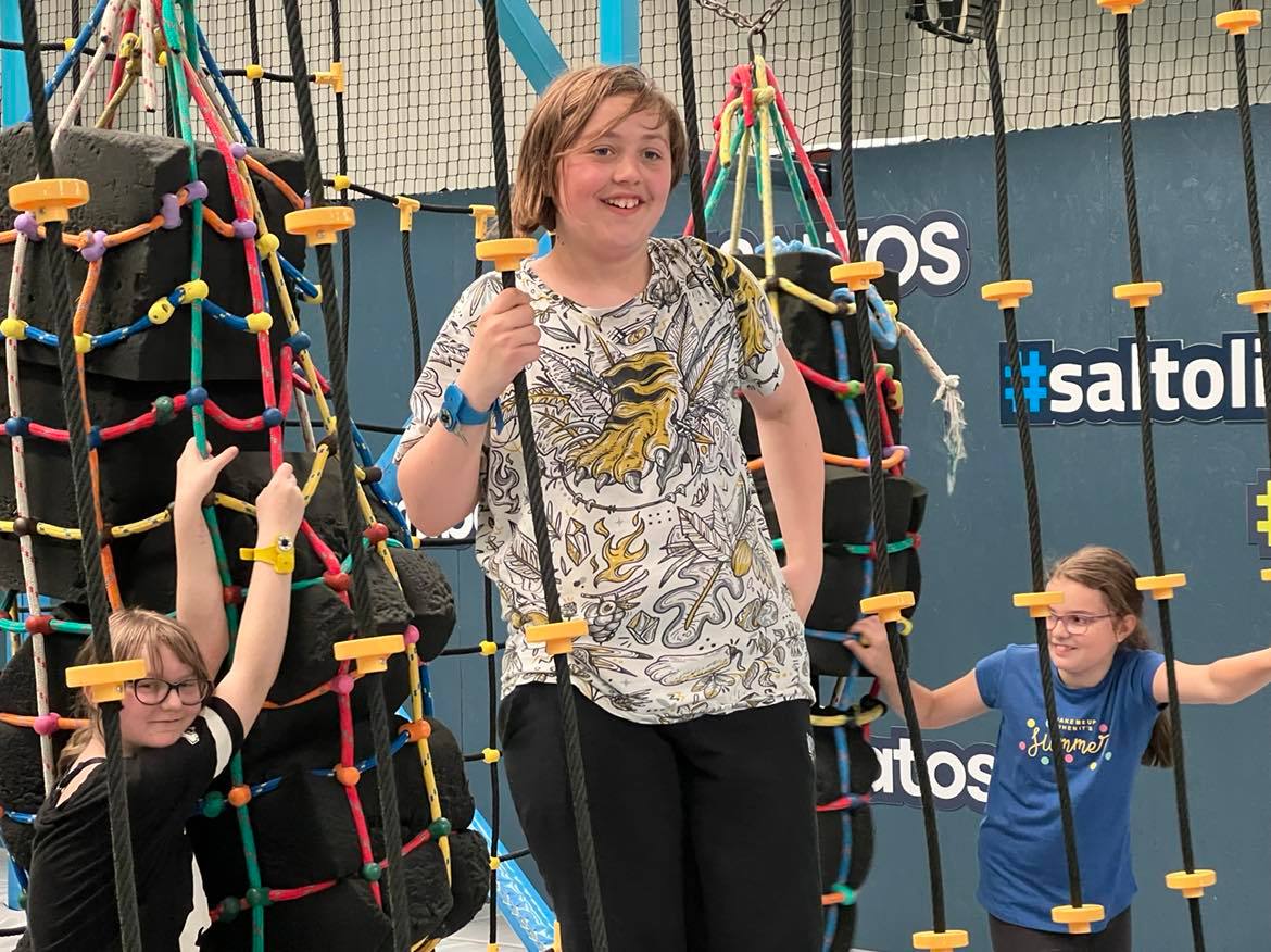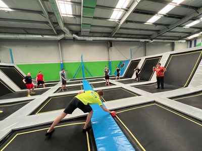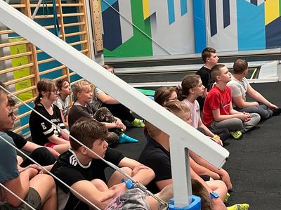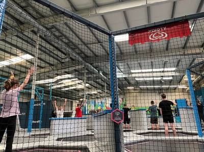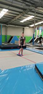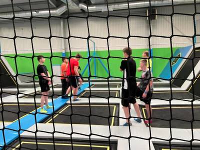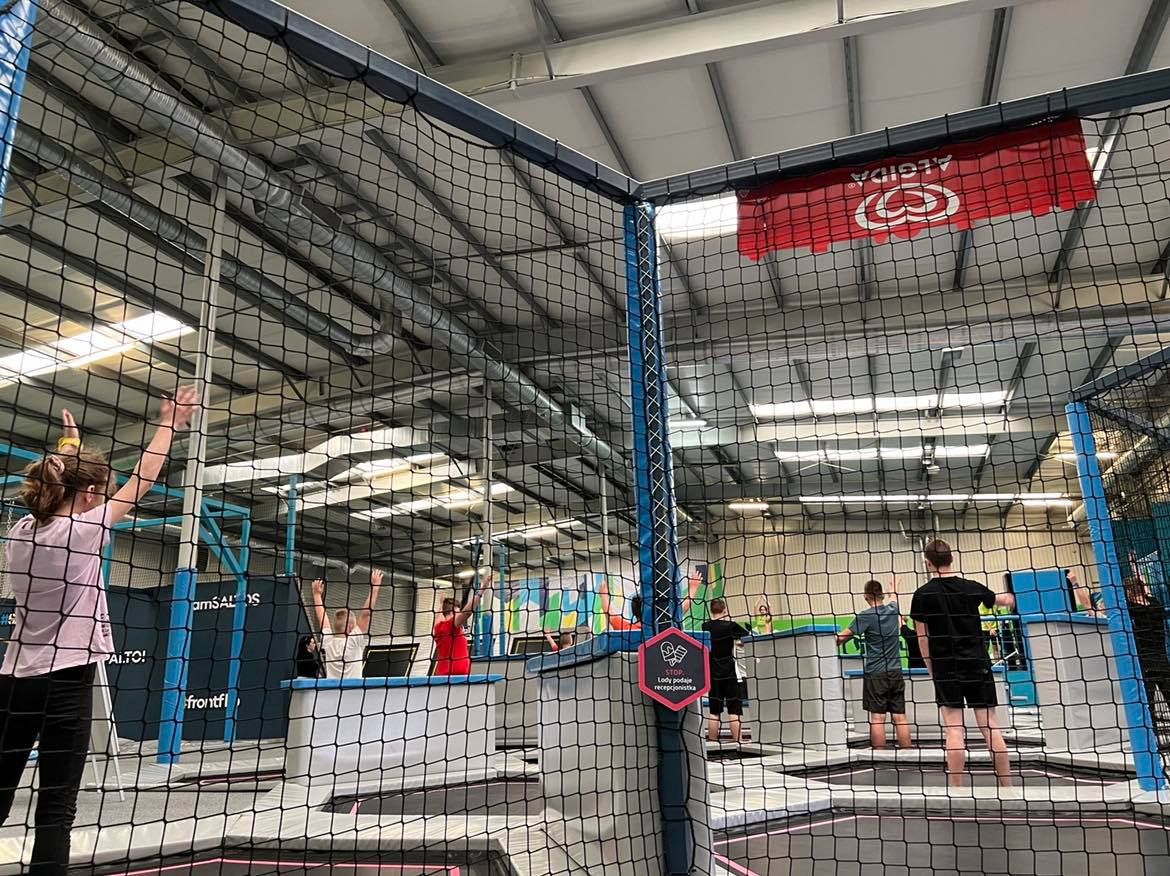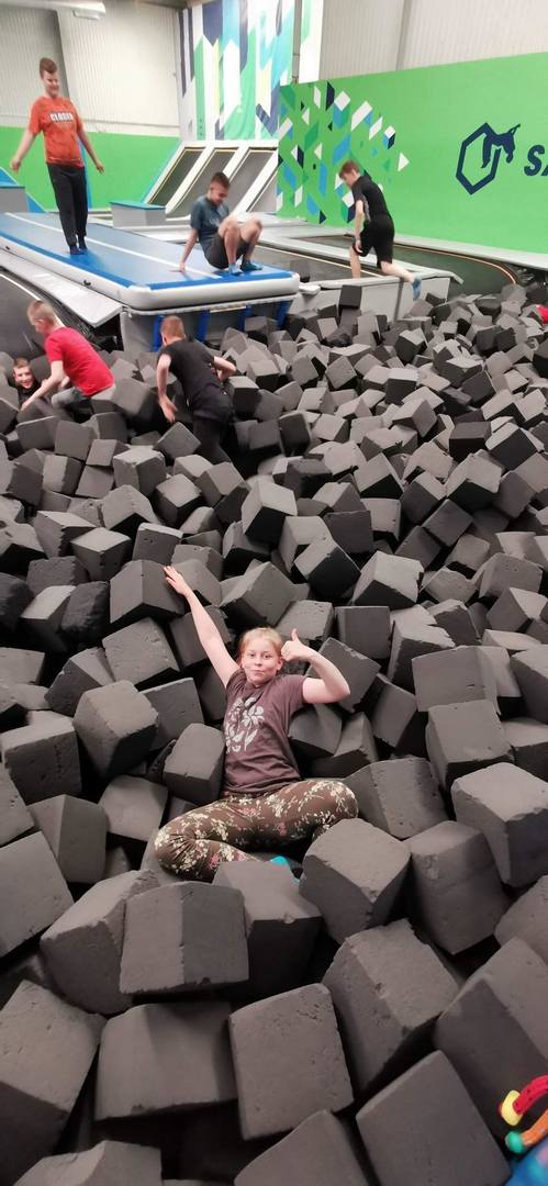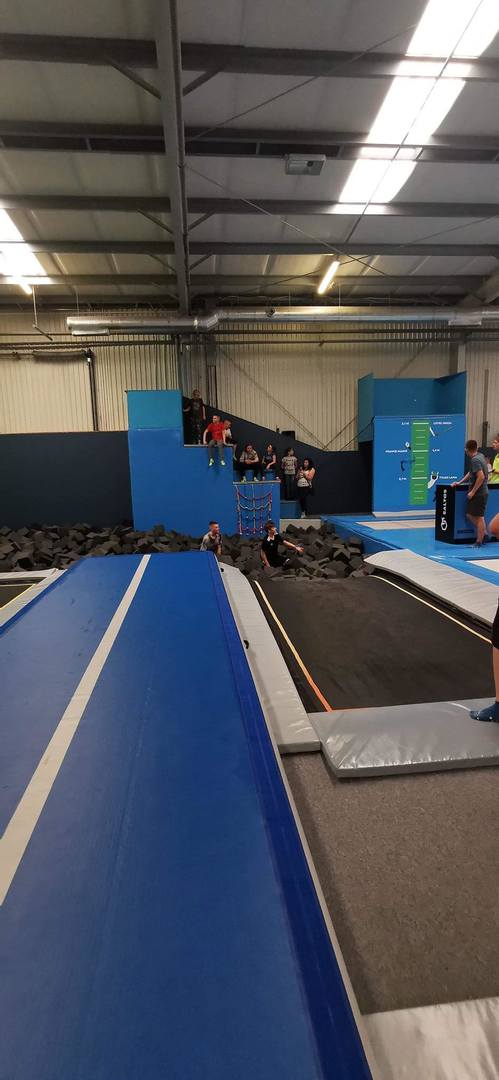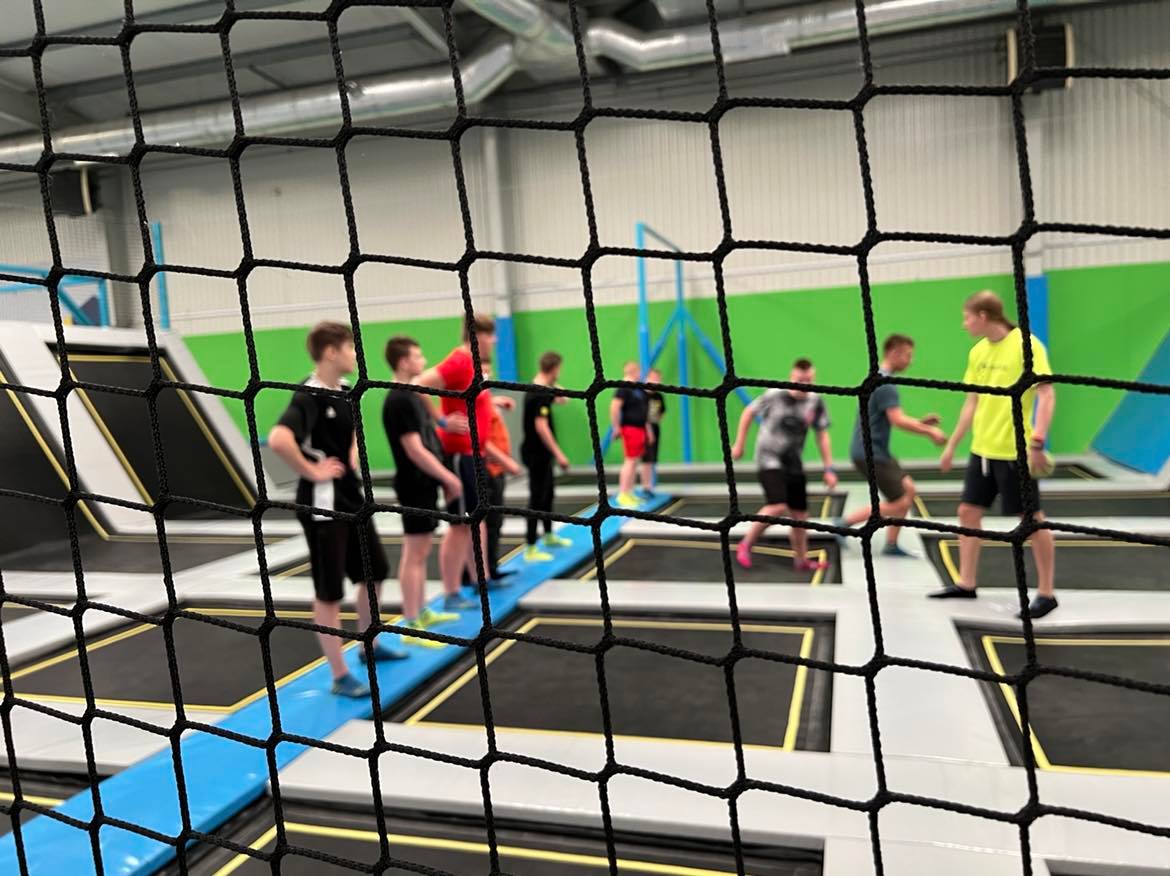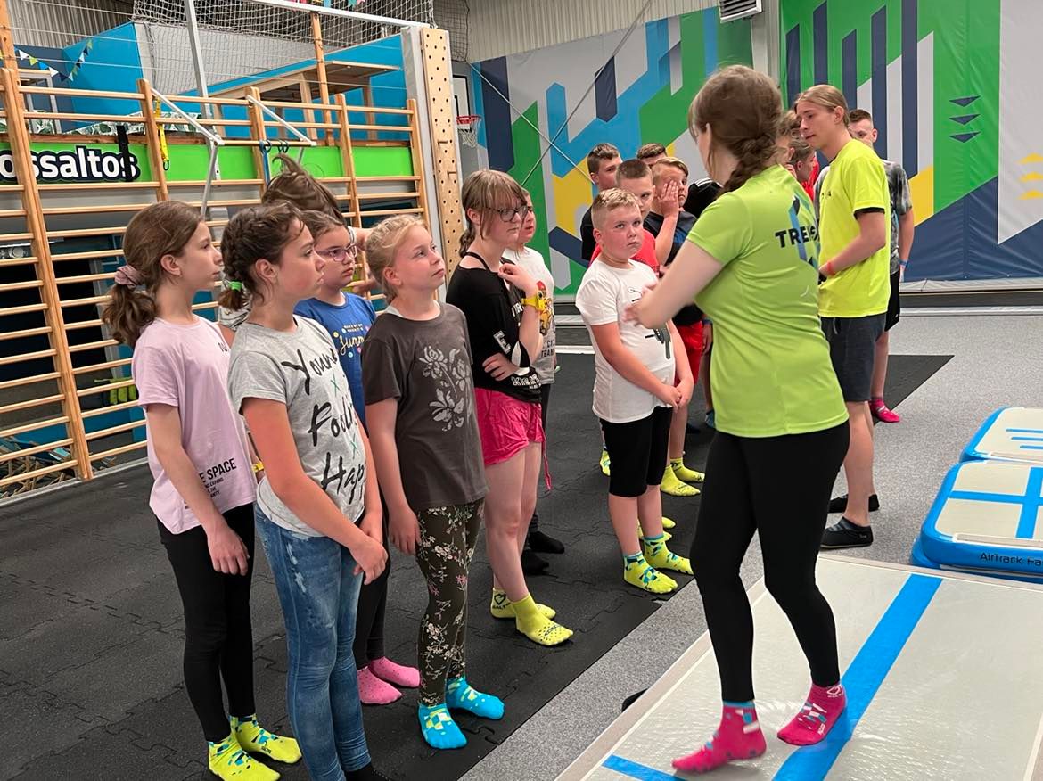 W programie wycieczki znalazły się najpierw zajęcia sportowe w parku trampolin „Saltos”. Uczniowie podzieleni na dwie grupy zamiennie uczestniczyli w poszczególnych zajęciach. W parku trampolin młodzi adepci na początku poznali podstawowe zasady bezpieczeństwa i prawidłowego korzystanie z trampolin. Następnie po krótkiej i dynamicznej rozgrzewce pod okiem instruktorów chłopcy i dziewczęta wykonywali skoki, kontrolowane upadki, podniebne akrobacje, a nawet salta w przód. Ponadto uczniowie podzieleni na małe grupy korzystali z trampolin sportowych, wykonywali skoki do basenu z piankami, korzystali z toru przeszkód nad basenem piankowym oraz grali w „zbijaka”. Zajęcia na trampolinach miały charakter zajęć wychowania fizycznego i były prowadzone przez instruktorów.