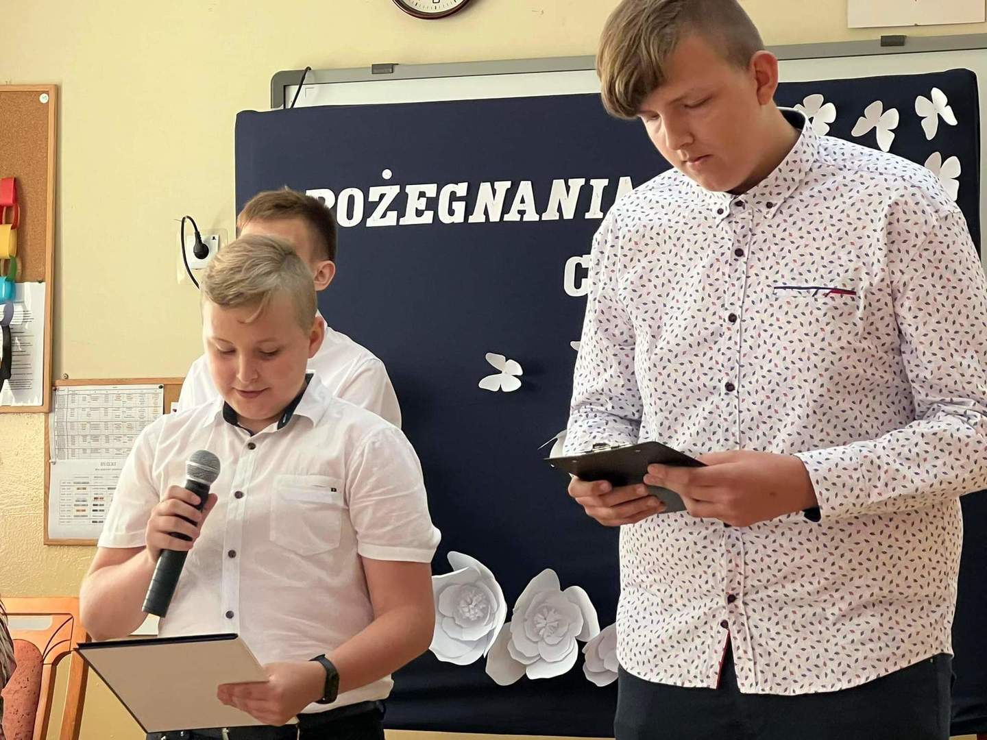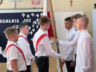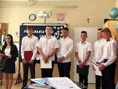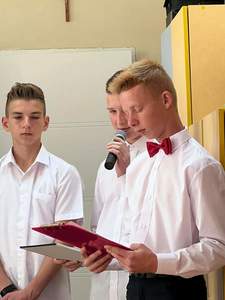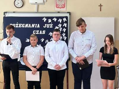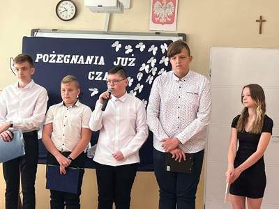 Uroczystość zakończyła część artystyczna. Pożegnanie klasy VIII przygotowała klasa VII pod opieką p. Marzeny Majtczak i Magdaleny Domżał. Uczniowie, którzy w minionym roku osiągnęli bardzo dobre wyniki w nauce i zachowaniu otrzymali nagrody książkowe. Pozostali odebrali świadectwa od wychowawców. Następnie z łezką w oku obejrzeliśmy prezentację multimedialną.