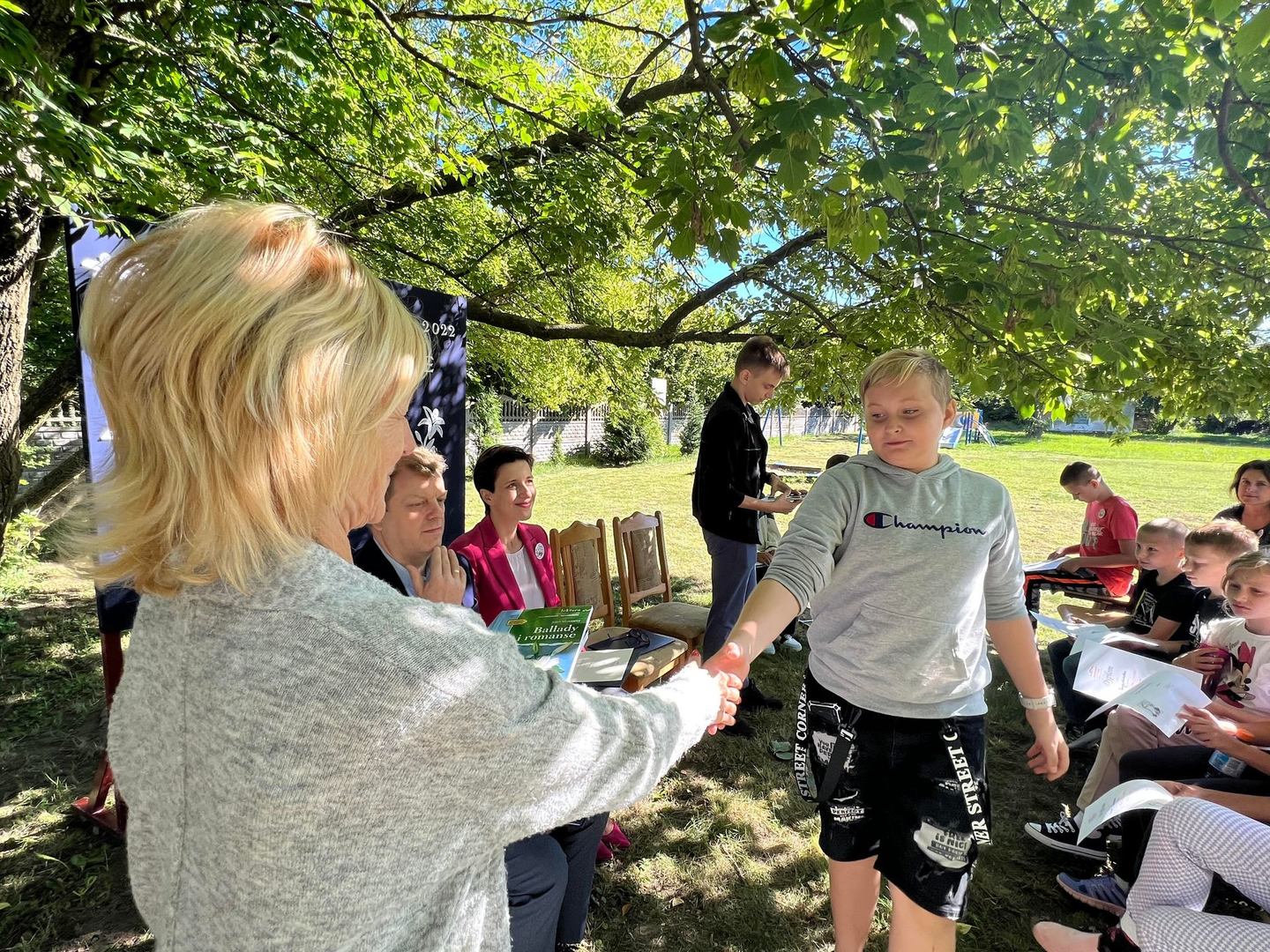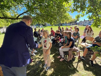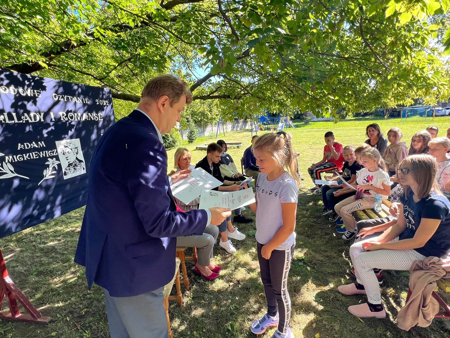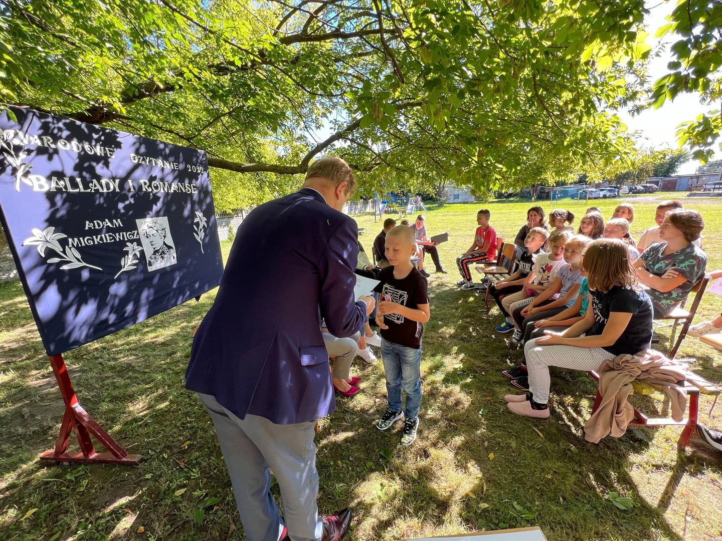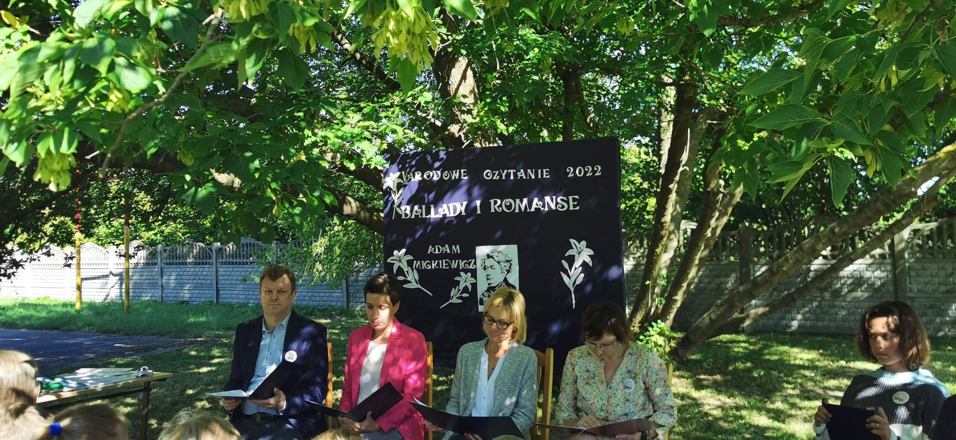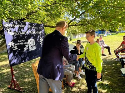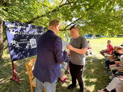 Dziś w przedpołudnie w plenerze na terenie Szkoły Podstawowej we Wroczynach odbyła się XI edycja Narodowego Czytania. Tegoroczna lektura - "Ballady i romanse" Adama Mickiewicza - to tom, który wyznacza początek polskiego romantyzmu. Został wydany w 1822 roku w Wilnie. We wspólnym czytaniu wybranych utworów – „Świtezianki” i „Powrotu taty” udział wzięli zaproszeni goście: p. Liliana Urbańczyk- Wójcik, Dyrektor Centrum Kultury Gminy Kutno, Robert Witczak, Dyrektor Centrum Usług Wspólnych, szkołę reprezentowały: Beata Cieślak, Dyrektor SP Wroczyny i Marzena Majtczak, nauczycielka języka polskiego oraz organizatorka akcji oraz uczniowie klas4- 8. Wszyscy uczestnicy akcji Narodowego Czytania zostali nagrodzeni pamiątkowymi dyplomami, a najaktywniejsi egzemplarzami książki z dedykacją od Wójt Gminy Kutno Justyny Jasińskiej. Dzisiejsze spotkanie było wspólnym świętem czytelnictwa. Wszystkim, którzy zdecydowali się odczytać fragmenty ww. ballad serdecznie dziękujemy za miłe spotkanie i do zobaczenia za rok!