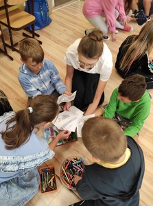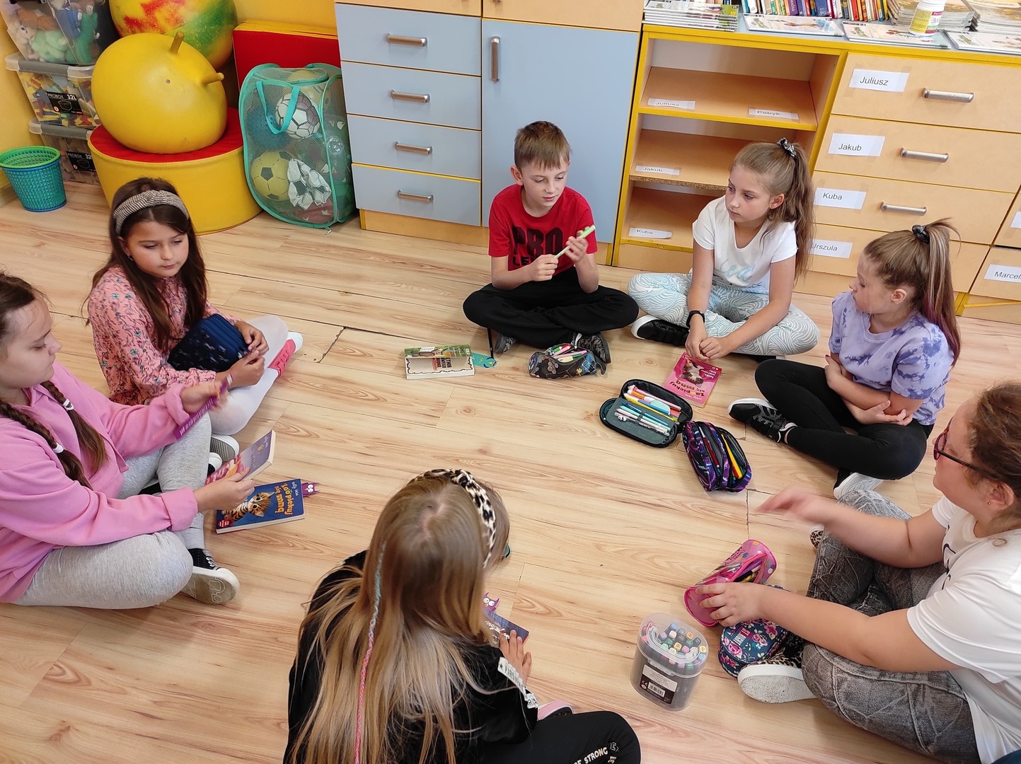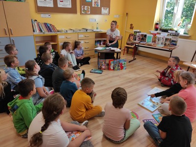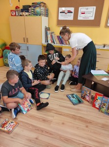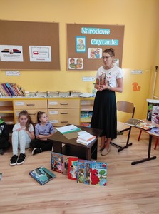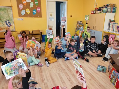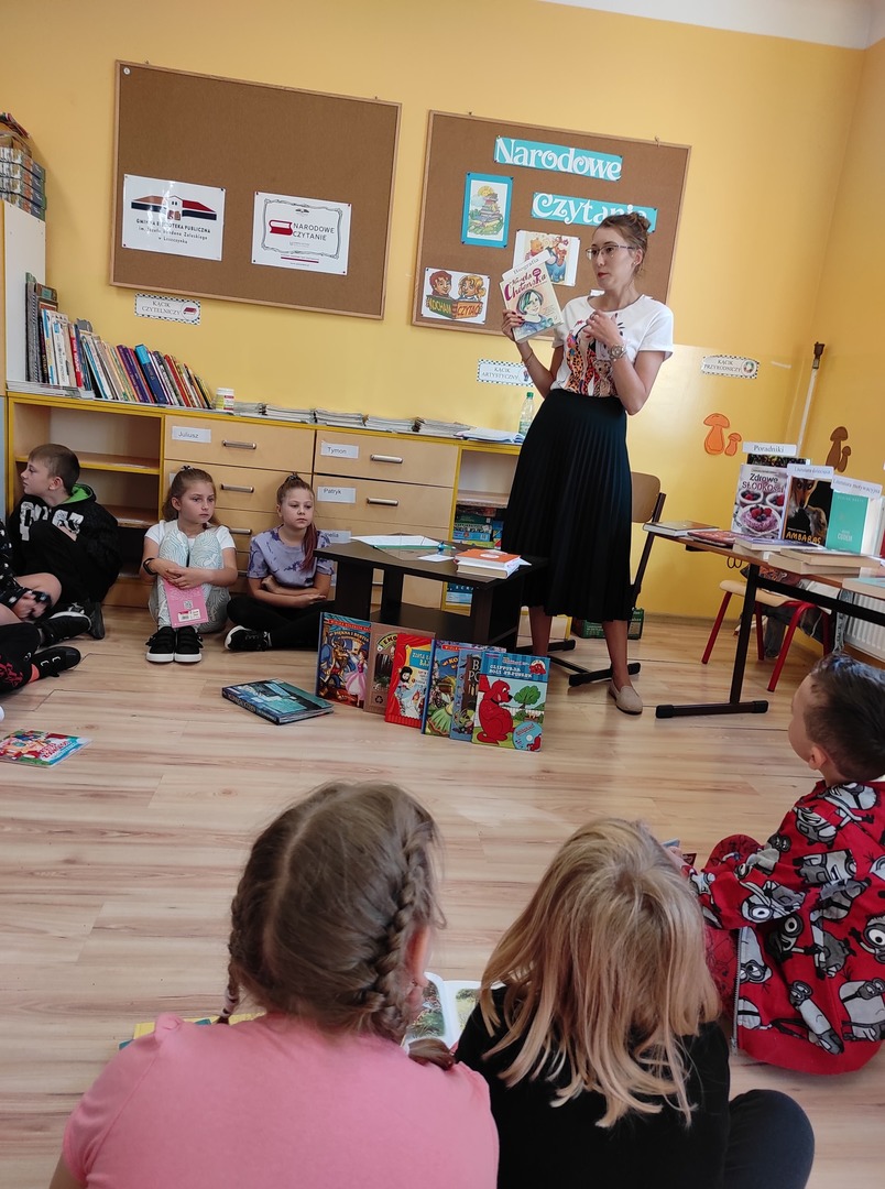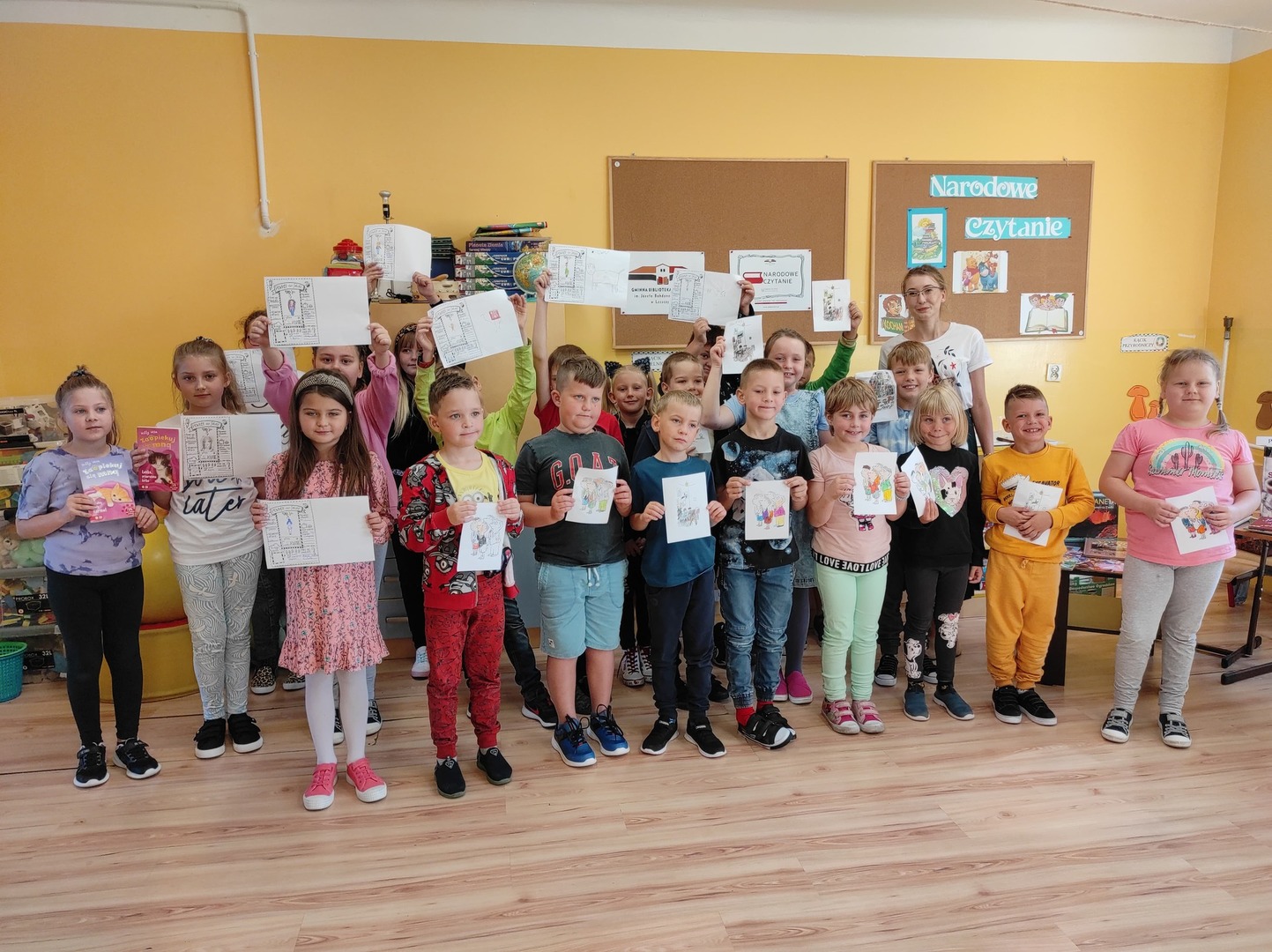 . Z tej okazji odwiedziła nas Pani biblioteka z Gminnej Biblioteki Publicznej im. Józefa Bohdana Zaleskiego w Leszczynku. Dzieci wysłuchały fragmentu książki pt.„Mikołajek”. Ponadto dowiedziały się jak wygląda praca w bibliotece oraz jakie są rodzaje książek. Na koniec uczniowie wykonali przepiękne ilustracje do wysłuchanego fragmentu książki.