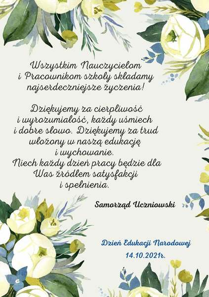 Drodzy pedagodzy, wychowawcy, pracownicy naszej szkoły oraz nauczyciele emerytowani. Z okazji Dnia Edukacji Narodowej składamy najserdeczniejsze życzenia, po stokroć zdrowia, niewyczerpanych sił i energii....